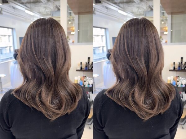 2種類のウィービング(ハイライト)を重ねて入れて、すいてある髪でも根元から毛先までしっかりとハイライトを出す、カラー技法のこと。