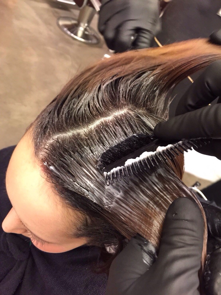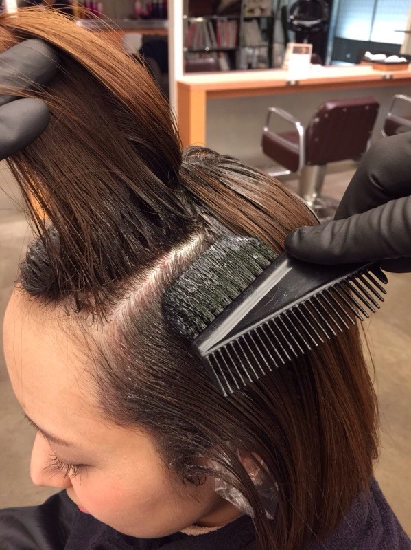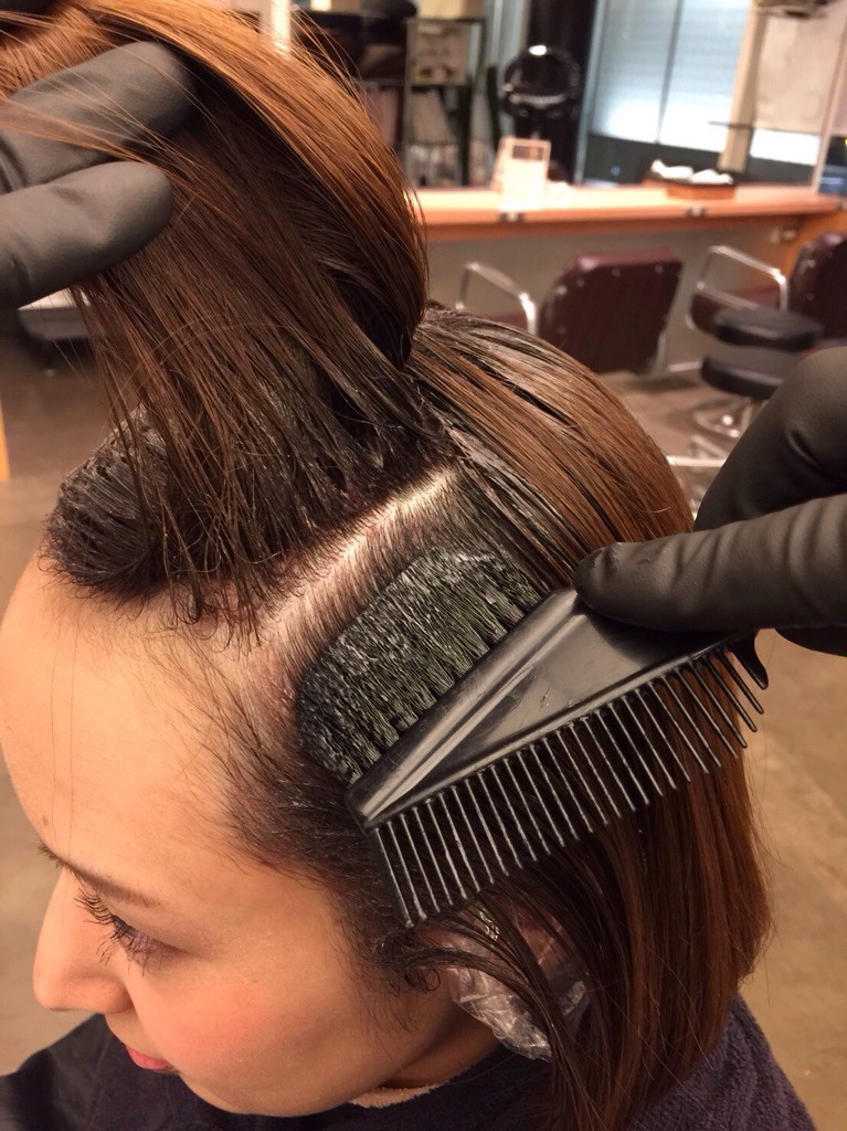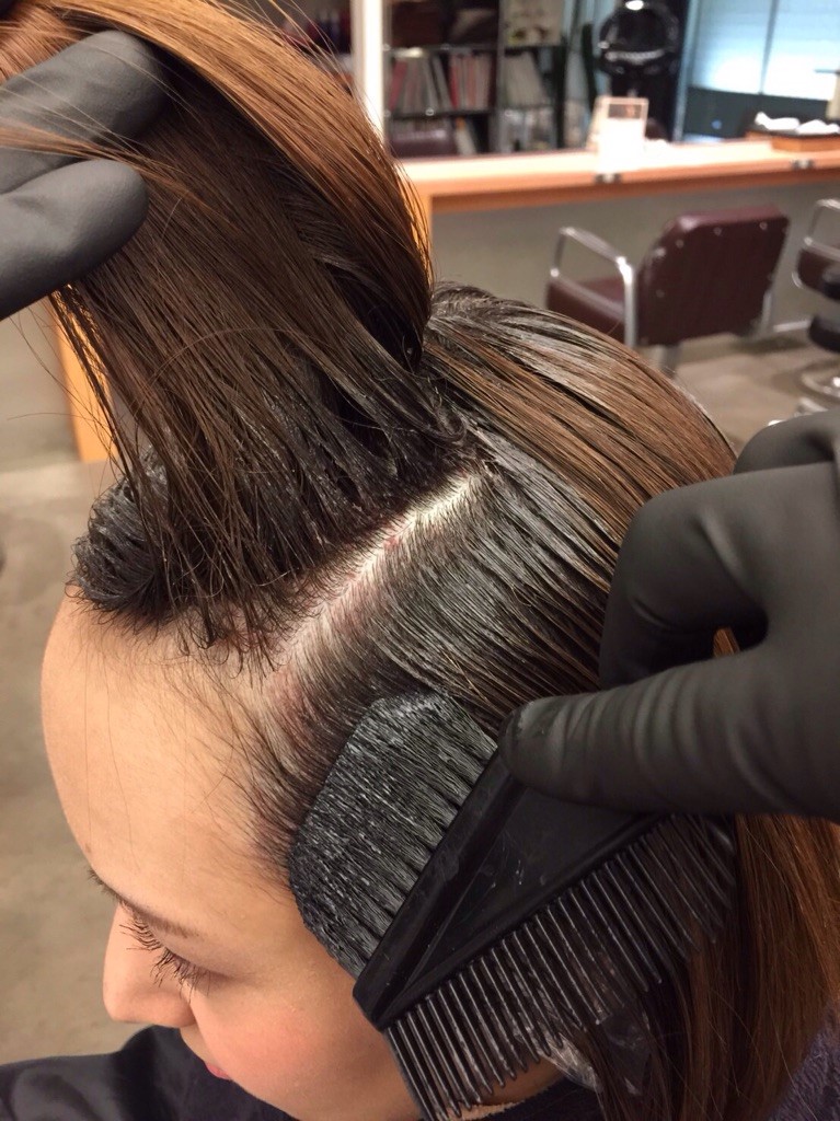 まず頭皮近くの新しく伸びてきた部分を染めたいきます。この時のポイントはハケの角度です!