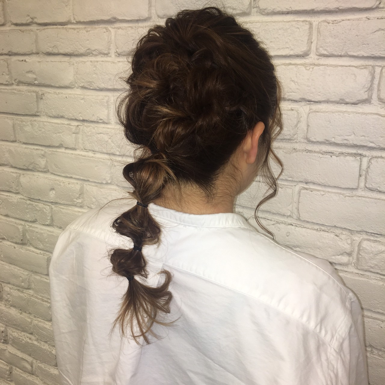 5あまった髪の毛を一つ結んで3こゴムをいれてくるりんぱしてあげて終わり!