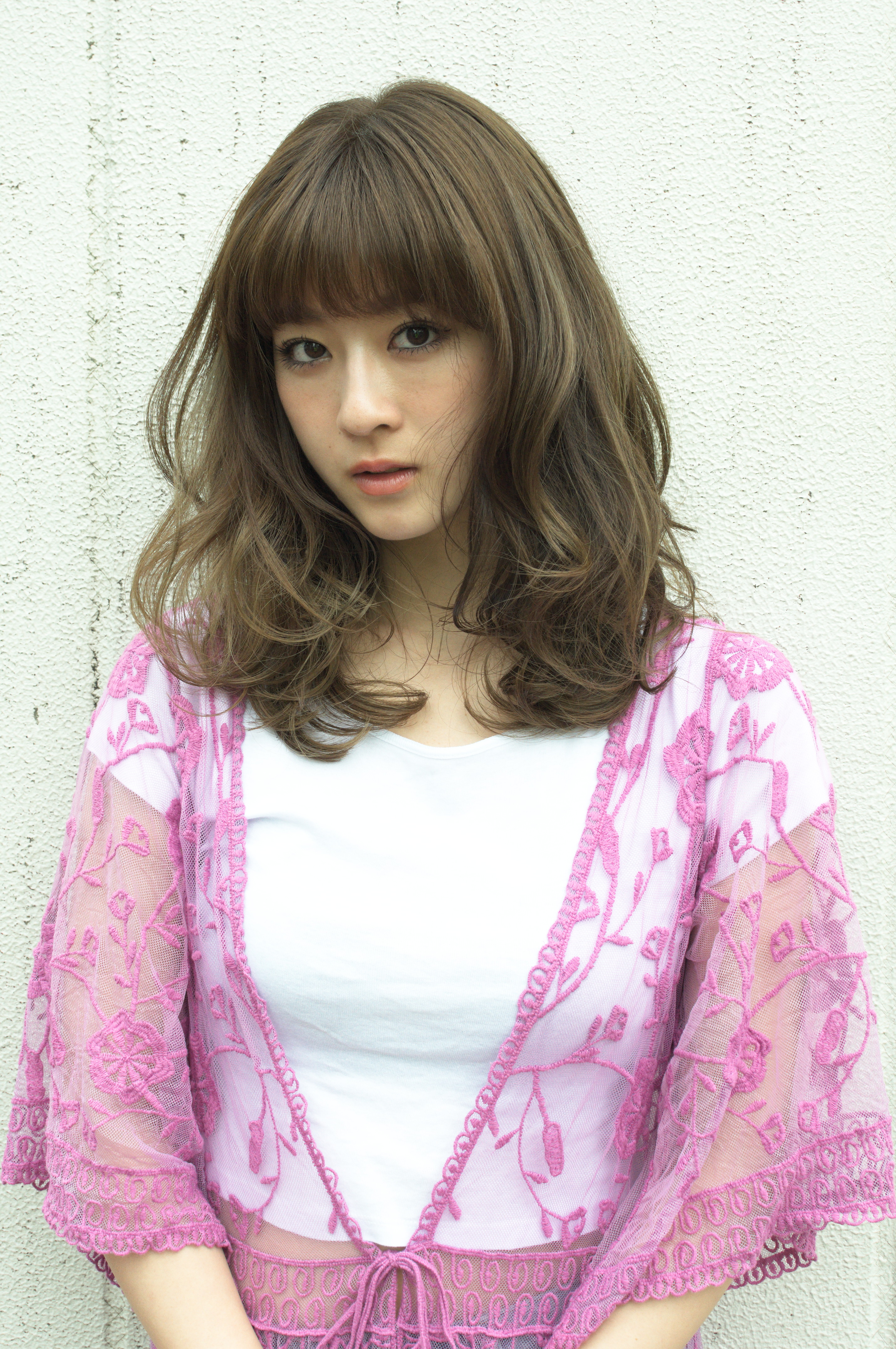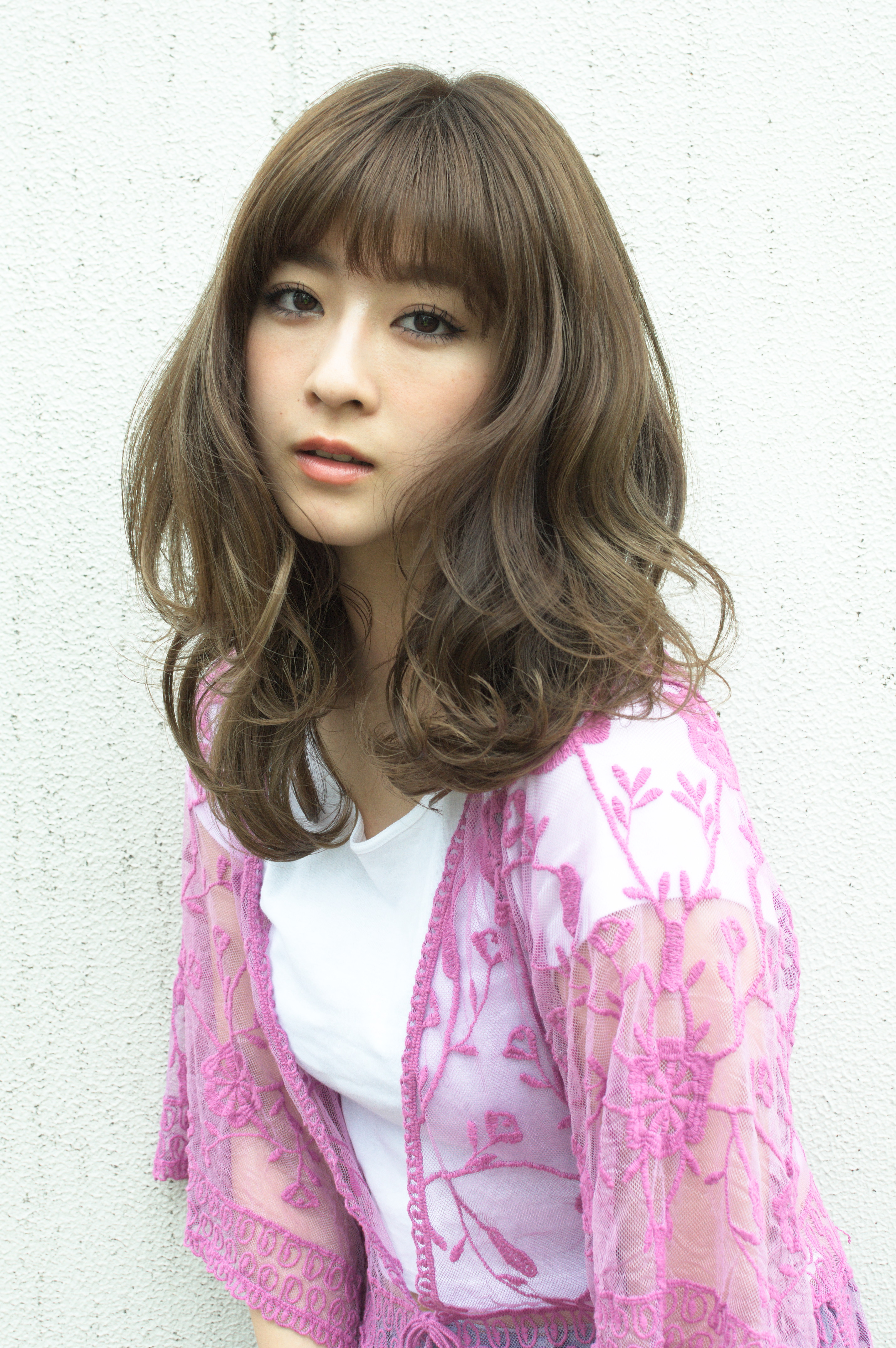 大人かわいいナチュラルウェーブセミロング!厚めバングに顔周りにレイヤーを入れたセミロングベースにスライドカットで動きをプラスさせます!カラーはハイライトにアッシュマットカラーで透明感をだし、低温デジタルパーマで無造作に決まる簡単ヘアスタイルです!