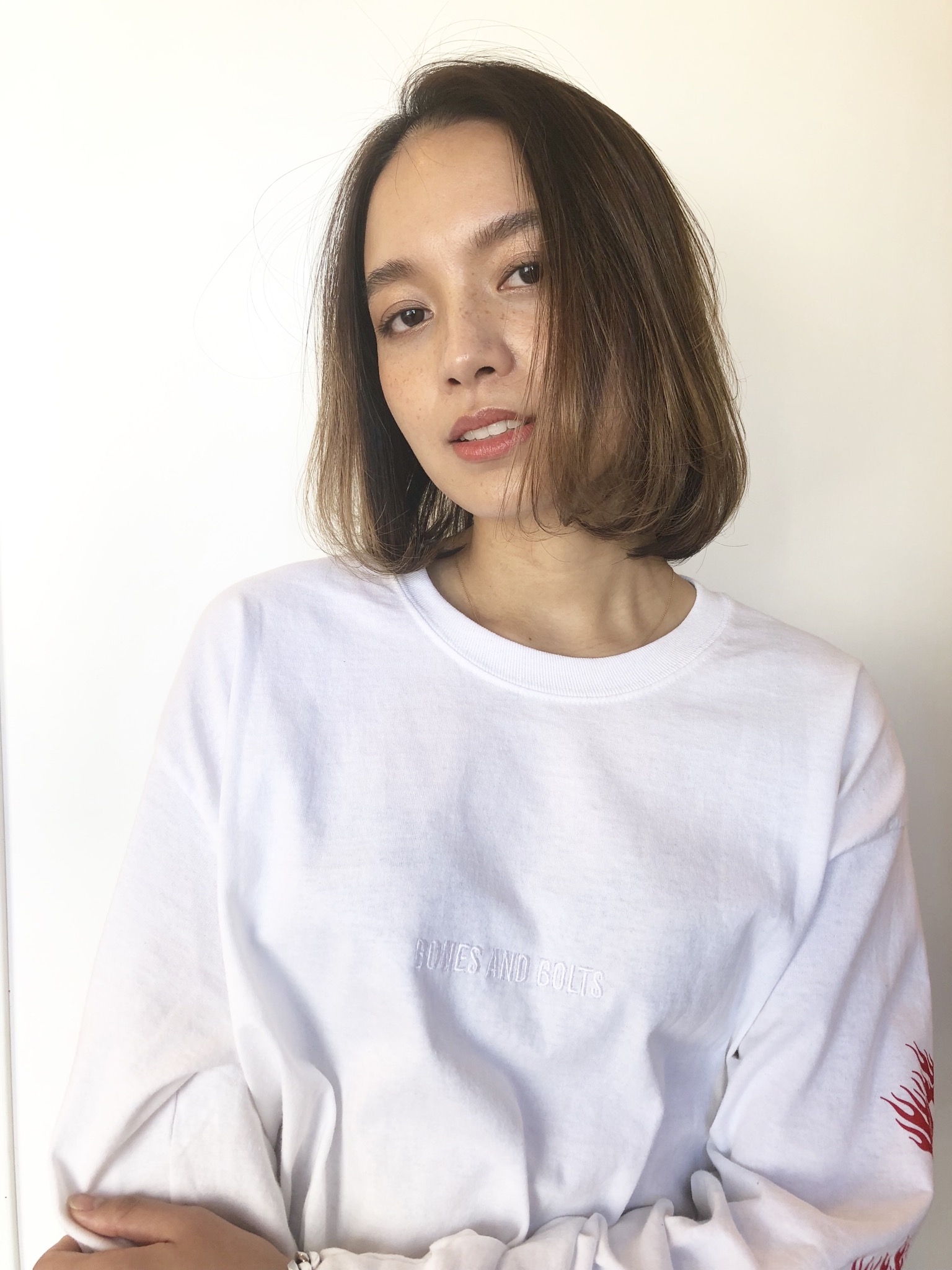 重ためのベースのボブなのですが、スライドカットでカットしているので髪をかきあげたときや髪をふったときとかなどに毛流れ動きがでるようになっているので、ただただ思いだけではないです!