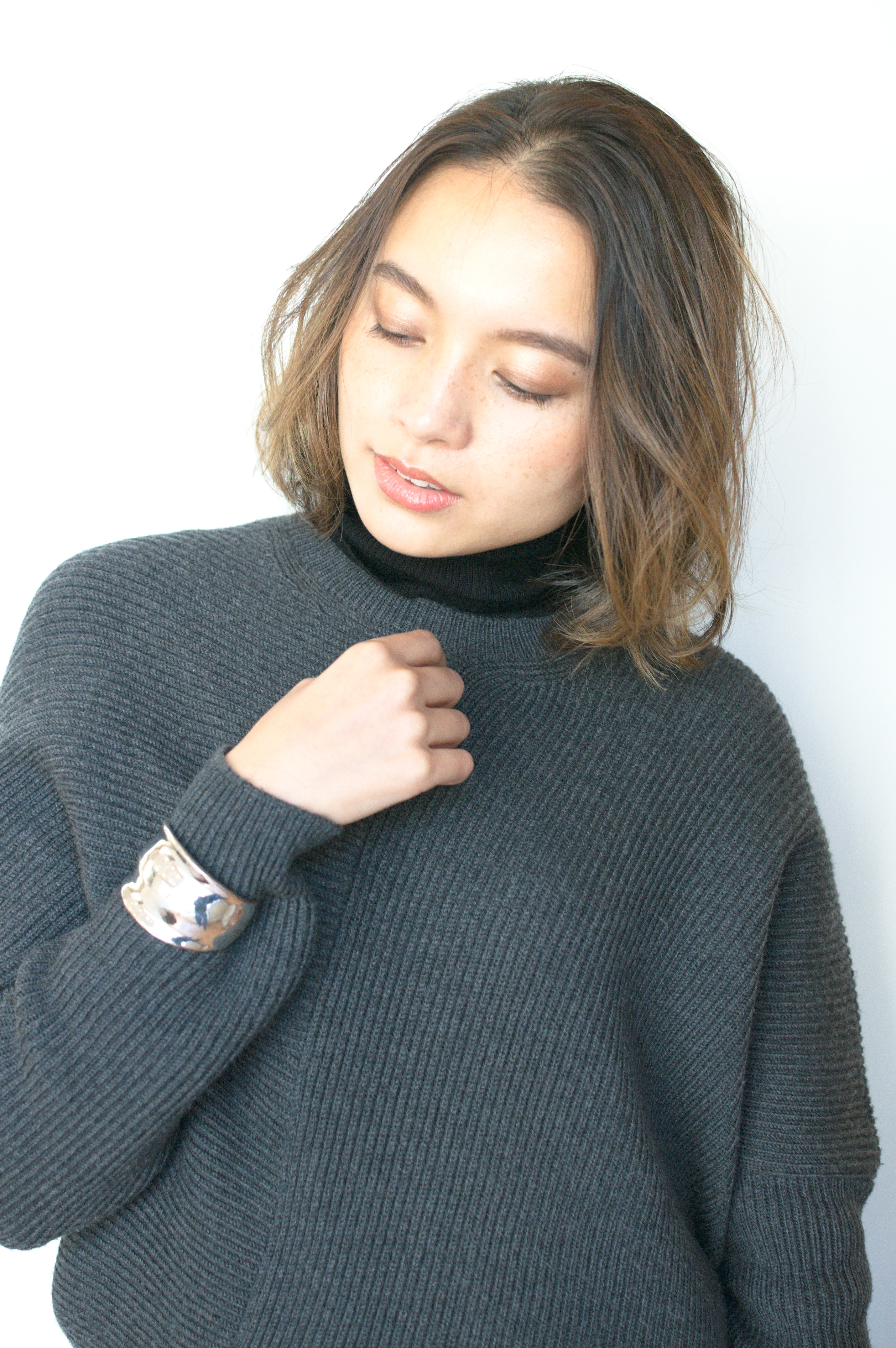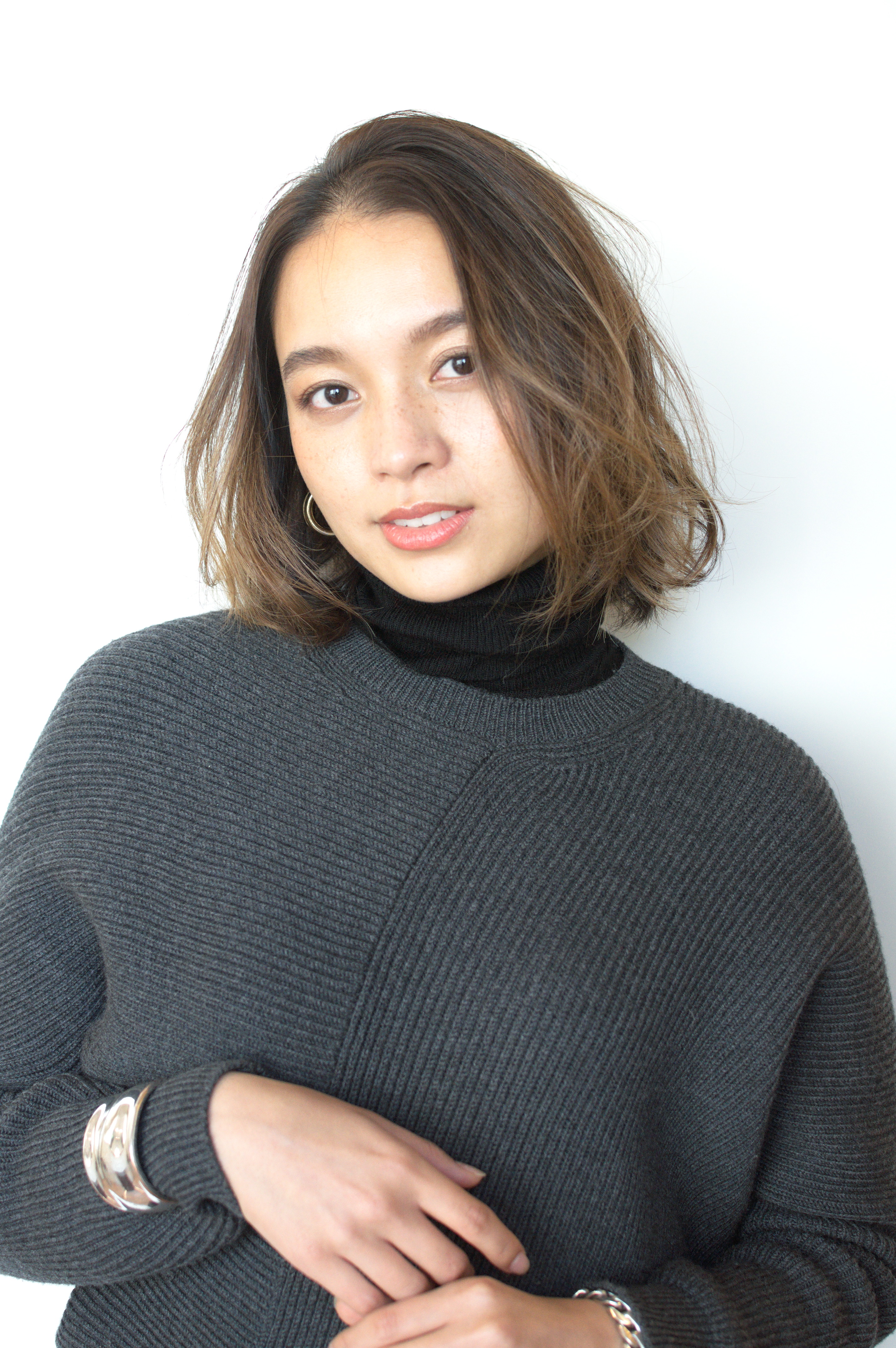 肩上大人ボブ。やや前下がりのボブにスライドカットで動きと束感をだします。パーマは低温デジタルパーマのナチュラルウェーブに細かく入れたハイライトにアッシュをプラスしたグラデ―ションカラーでおしゃれボブに。大人かわいいナチュラルボブです。