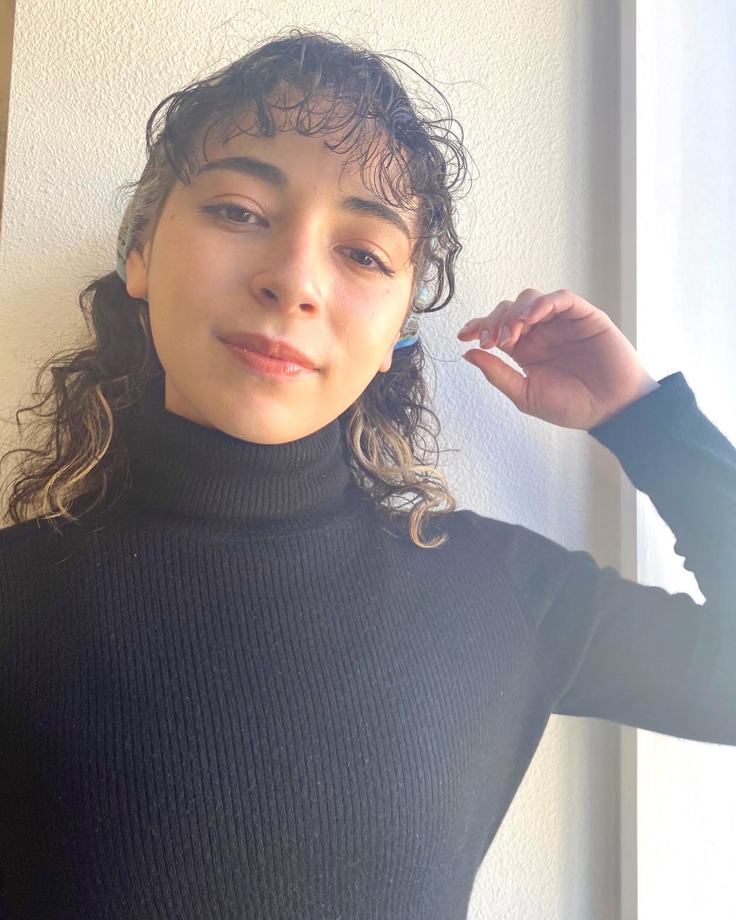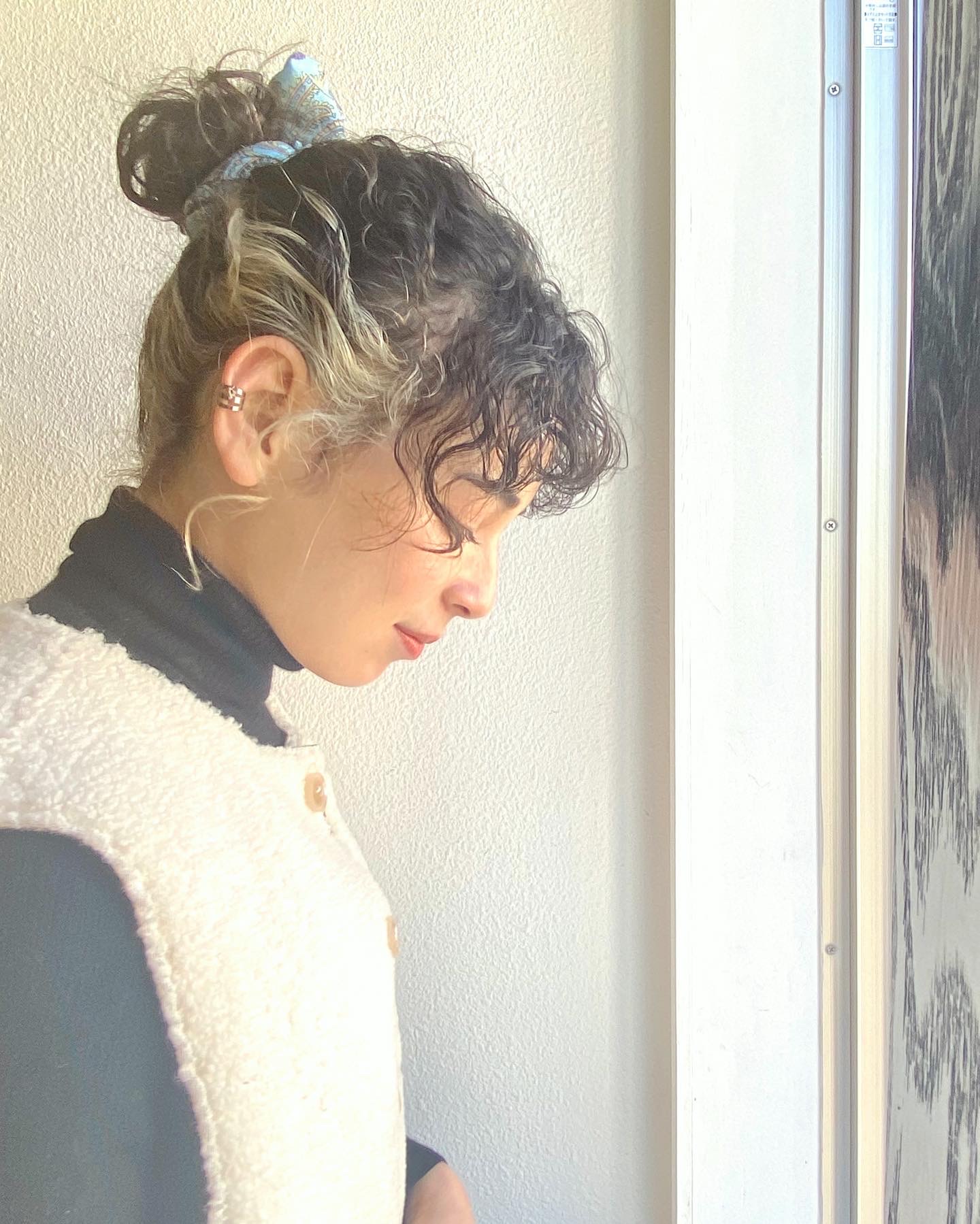 ルーズなお団子ヘアと、きつめのバンダナのバランスが可愛い♡!