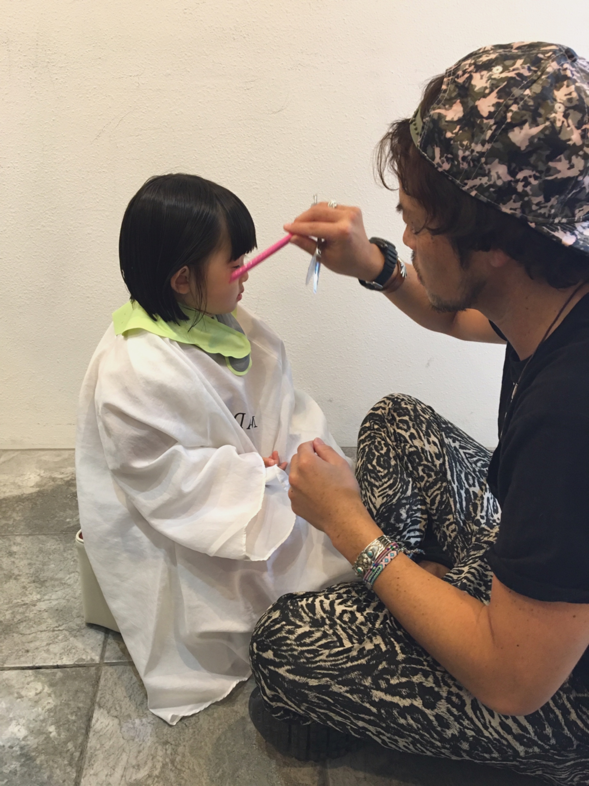 DIFINO(ディフィー)には、お子様専用の椅子、カットクロス、お子様を抱っこしながら付けれる親子クロス等があるので色々対応可能です。