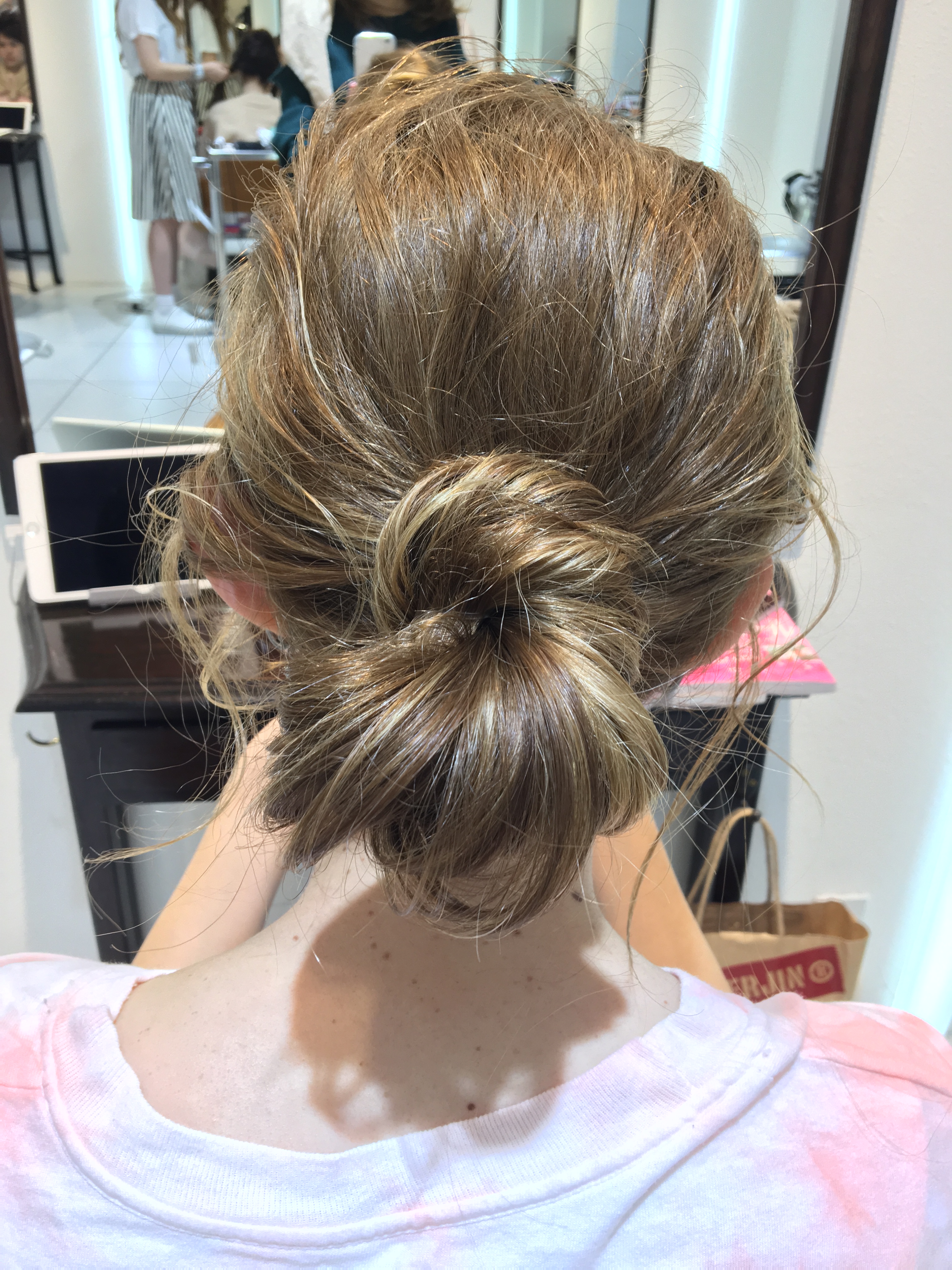 少し、下の方で緩く結んで間から毛束を入れ込んだ後に