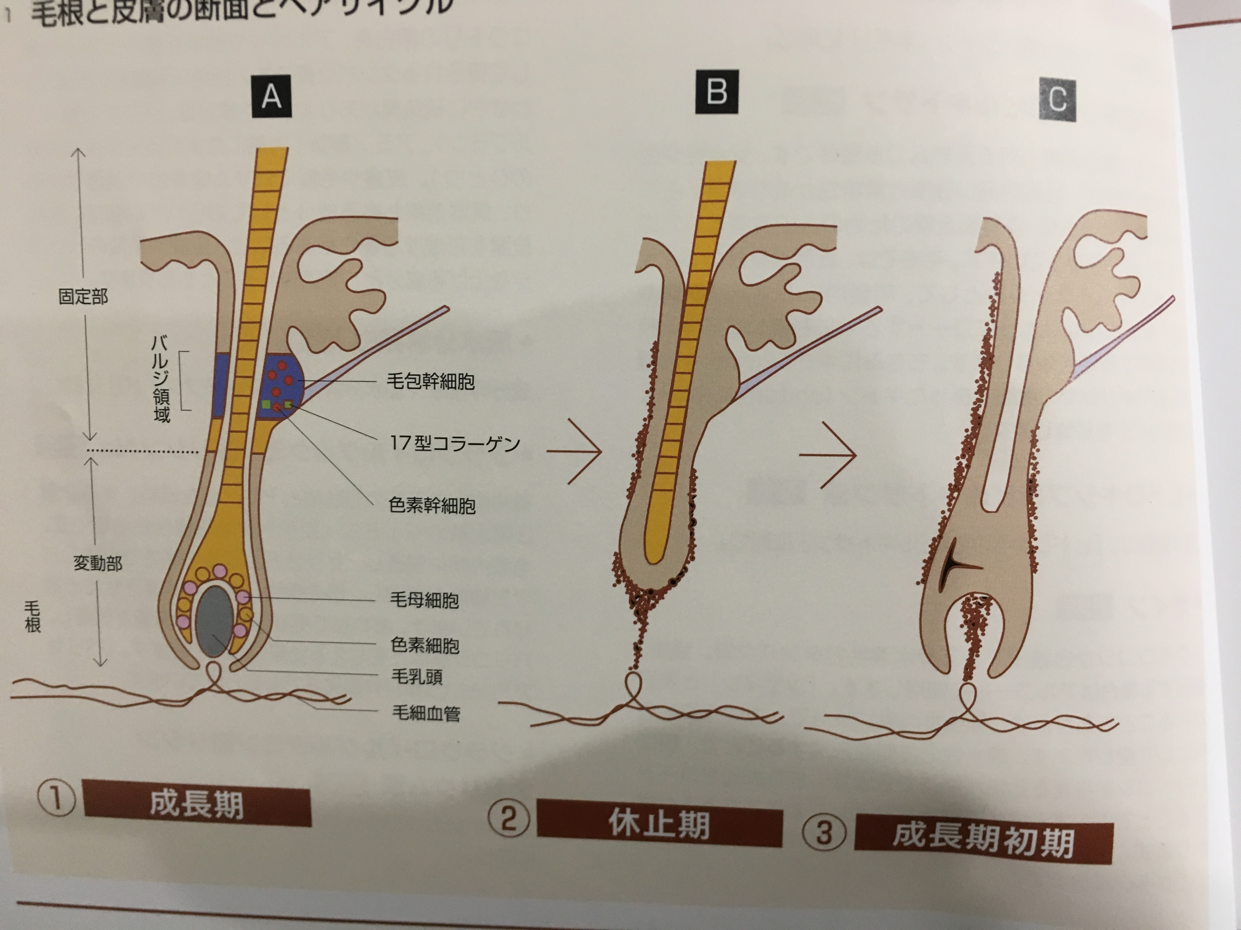 ヘアサイクルの成長期から退行期をはさんで休止期までを見ると、毛乳頭などがある変動部がどんどんなくなっていくのがわかります。