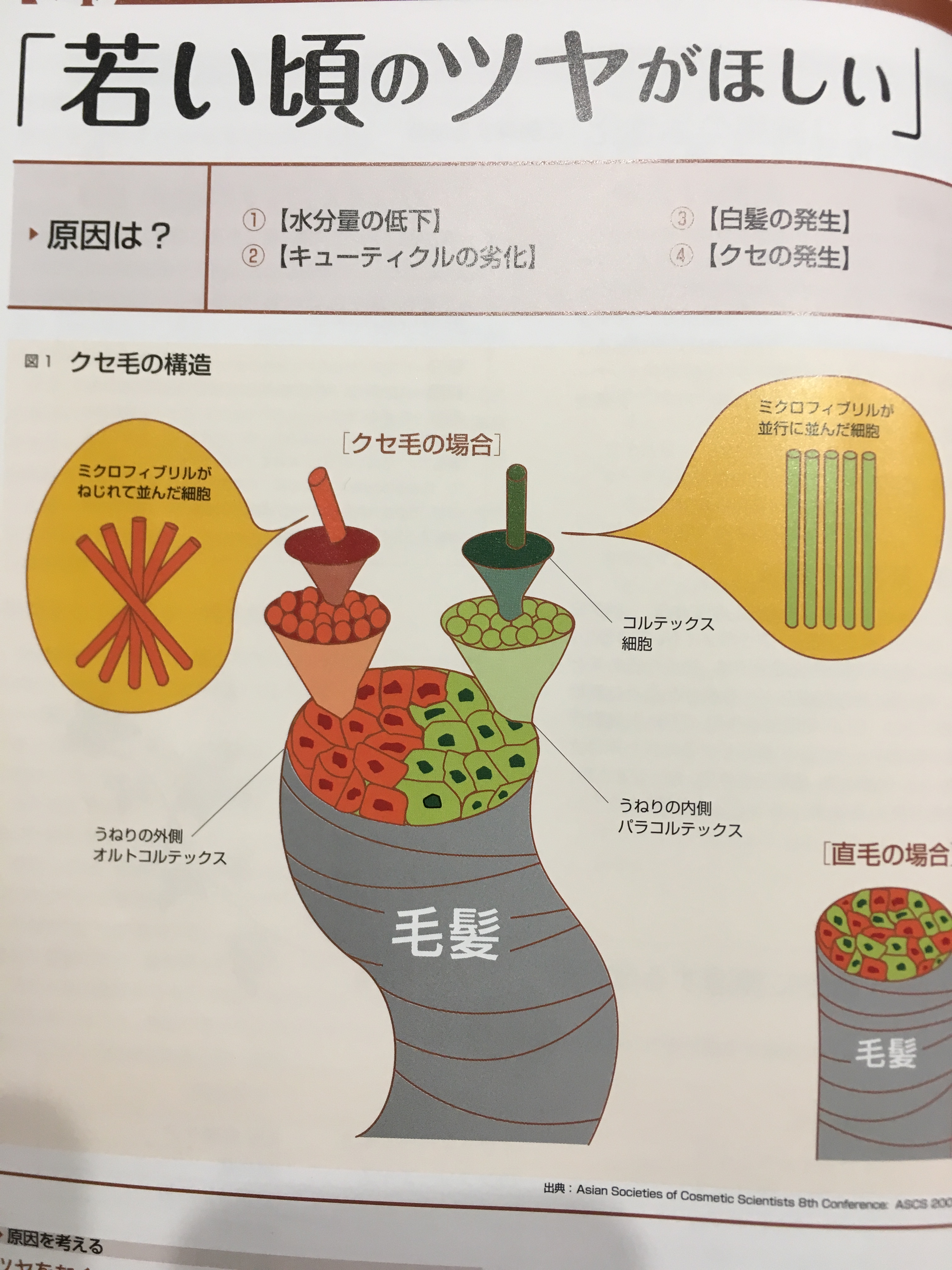 ちなみにクセは昔は毛穴の変形が原因と言われてましたが、最近では毛包内(毛乳頭)での非対称的な分化に起因するところが大きいと言われています。したがって、毛髪繊維は、形状記憶材料と考えることができます。