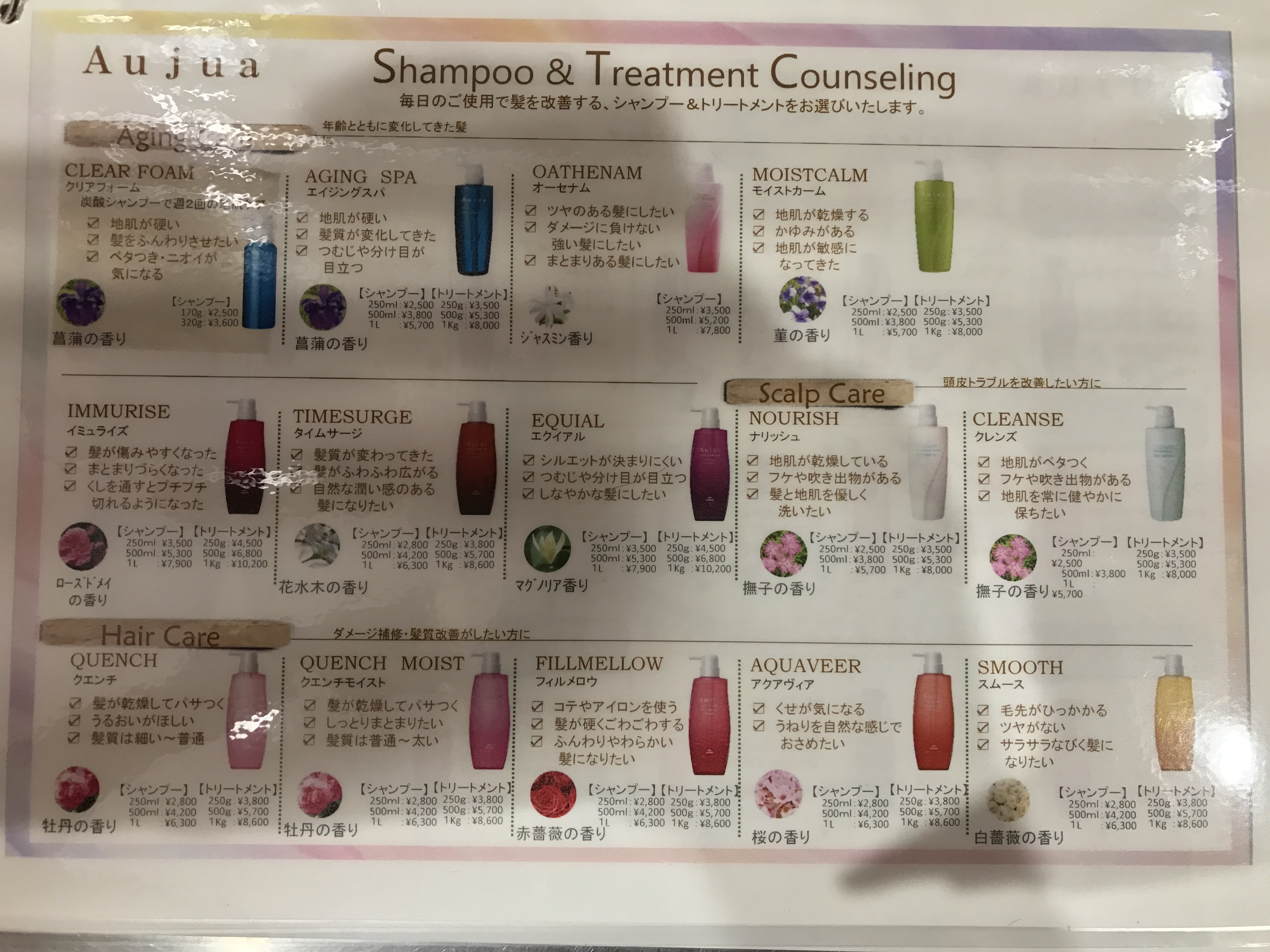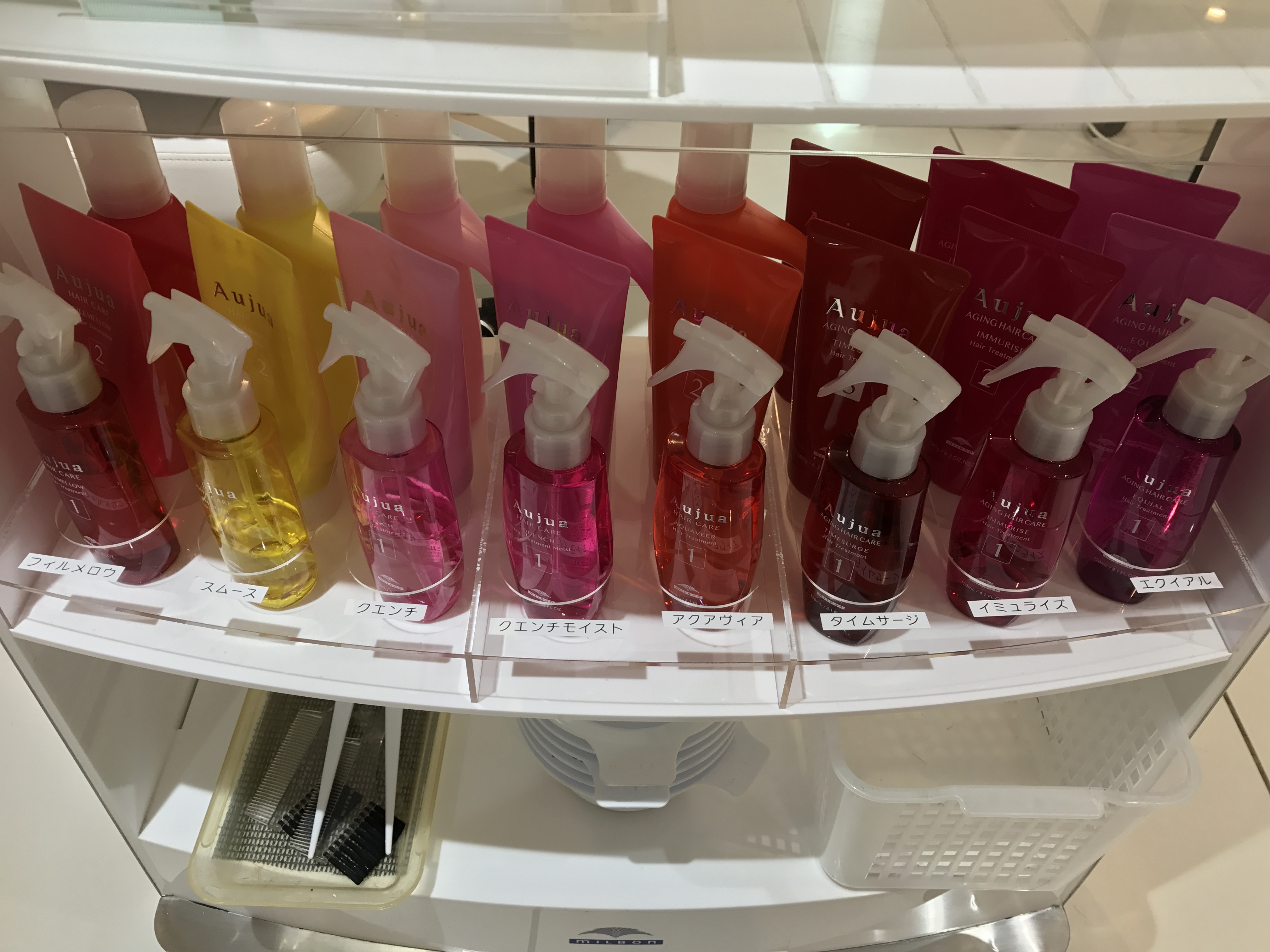 Aujuaのシャンプーはリニューアル後13種類になり、お店でする髪の毛用のトリートメントは8種類です😉