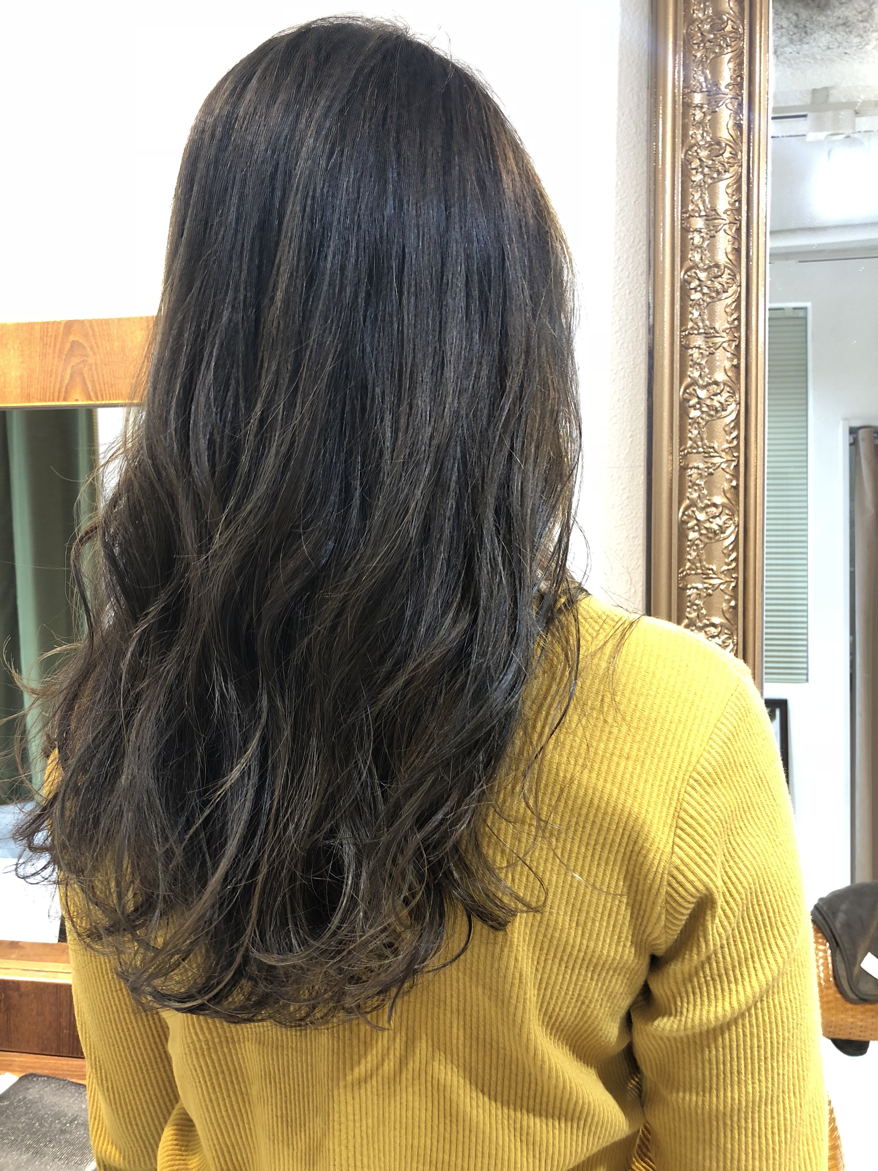 全体の色は、トーンダウンさせて、重たい印象になり過ぎない様に細めのハイライトをグラデーションになる様に入れることで、重めのロングヘアでダークカラーでも、抜け感が出るのでおススメです。
