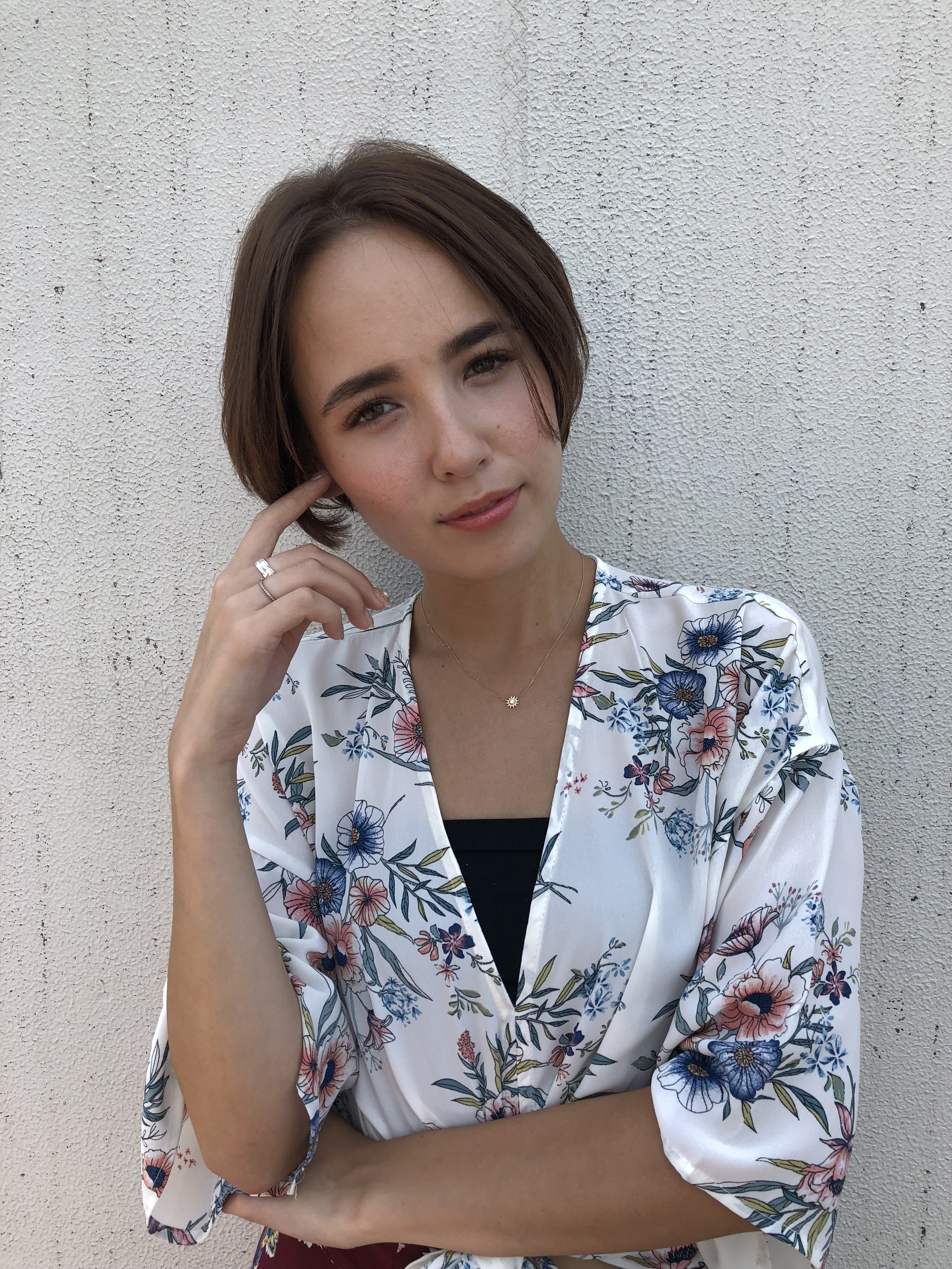 シンプルな前下がりショートボブ!誰にでも似合わせやすいセンターパートのショートボブです!Rカットでやわらい丸みのあるボブに!ハイライトで立体感、動きを出しイルミナカラーのアッシュベージュでツヤ感アップ!ニュアンスパーマで遊びを出します!