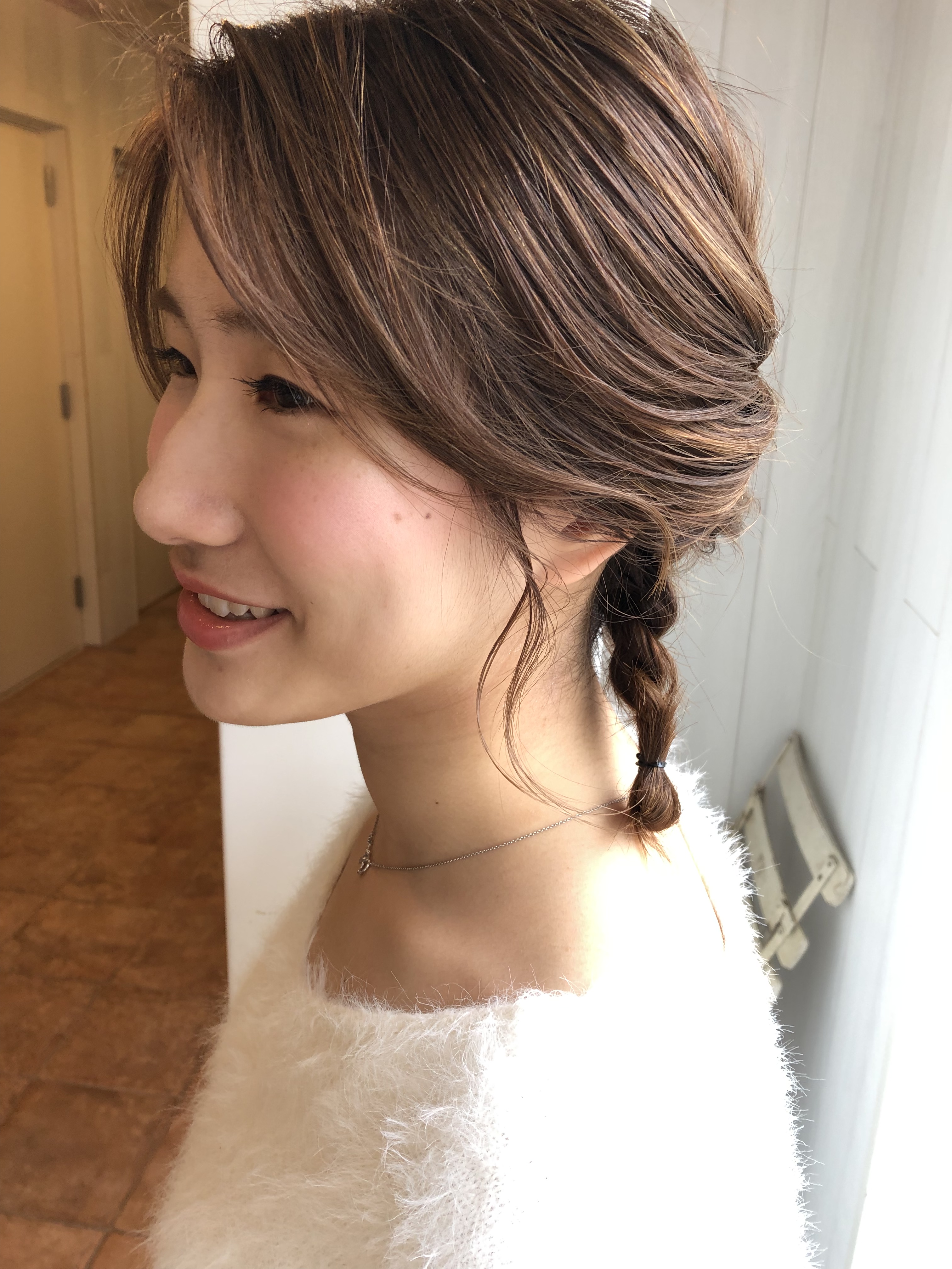 毛先を三つ編みにしたスタイルで
