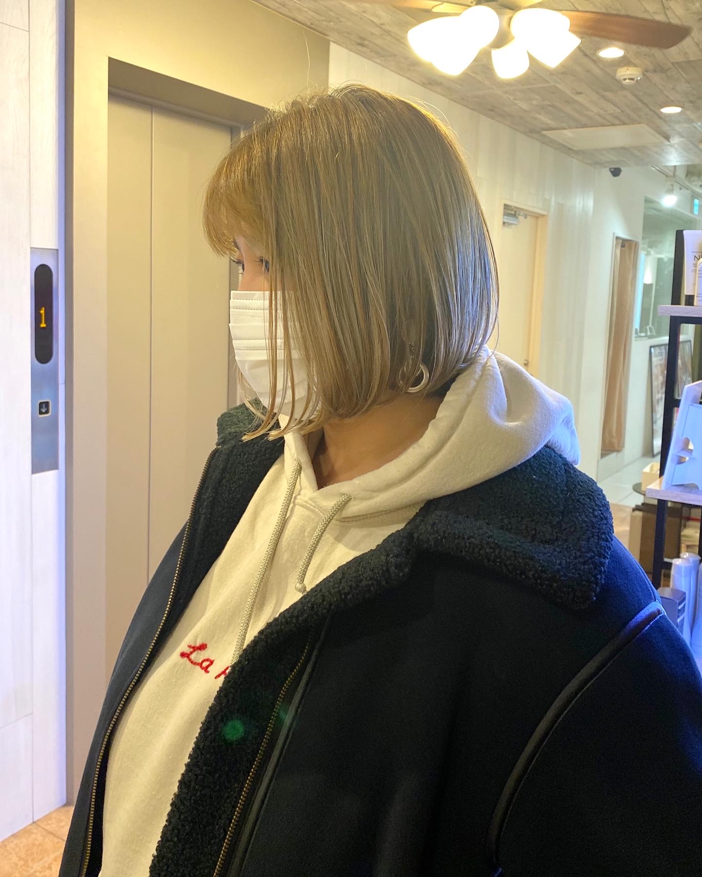 トリプルカラーをして仕上げたハイトーンベージュカラーに、フラットめの前下がりボブヘア★