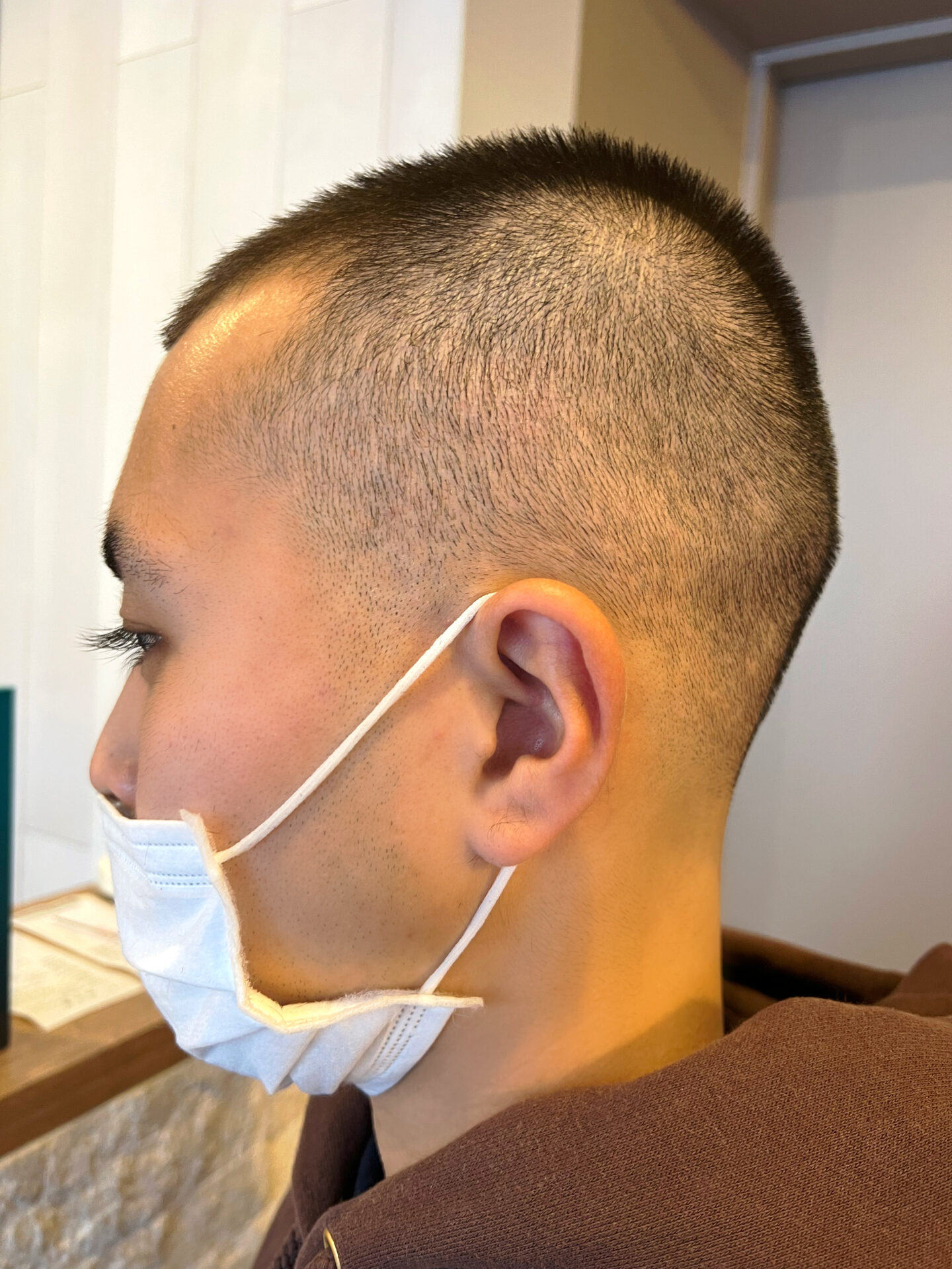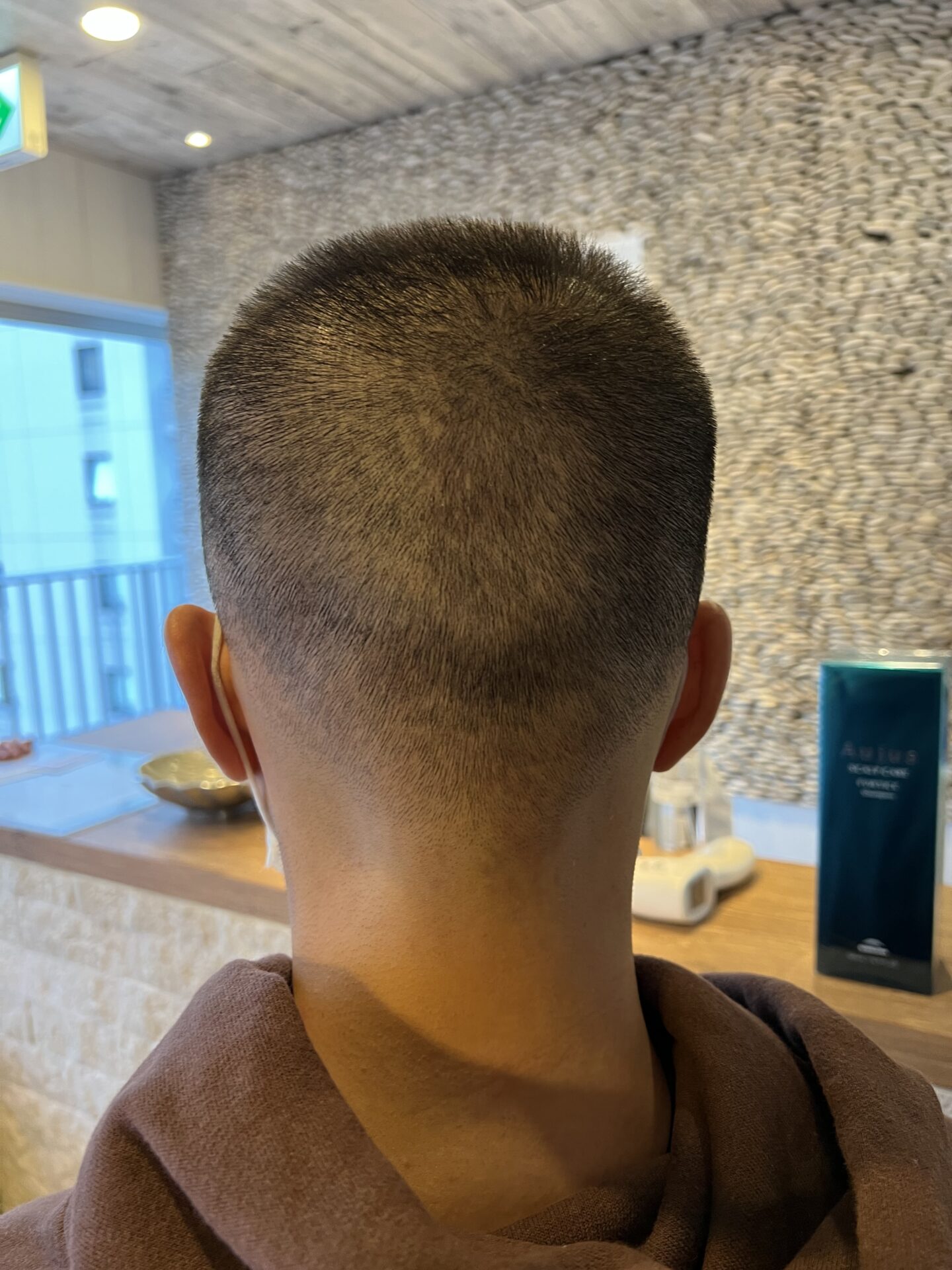 ただの坊主ではなく、グラデーションで長さに差をつけることでオシャレな坊主にしました。