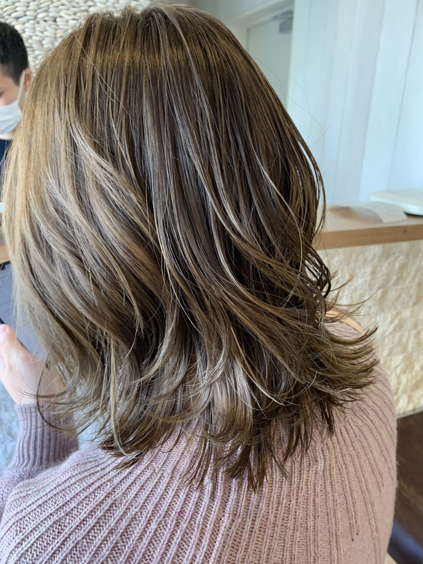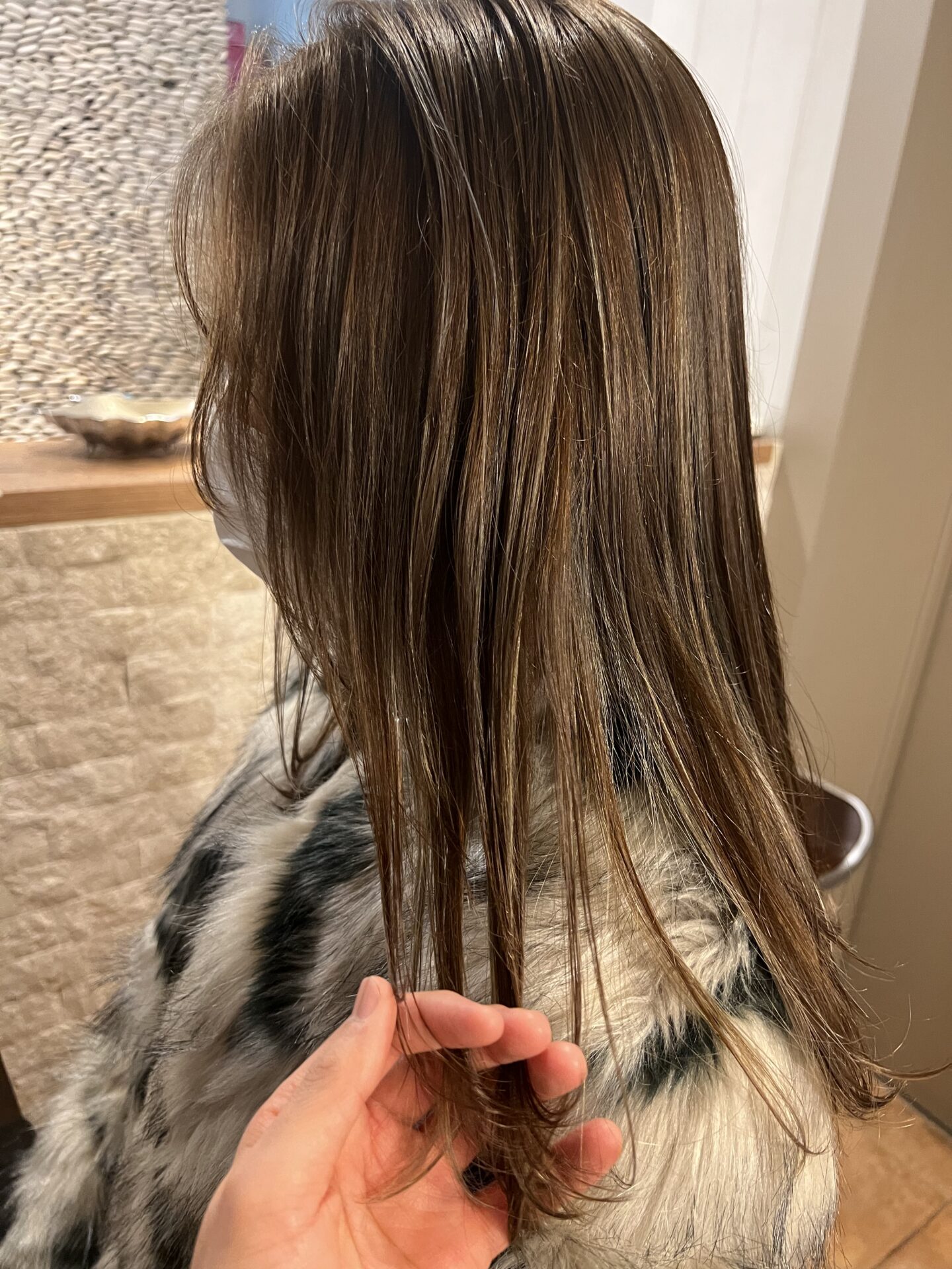 前回、別のお店でガッツリハイライトを入れて、最初は良かったけど、伸びてきたら巻かないと汚く見えてとお悩みのお客様。