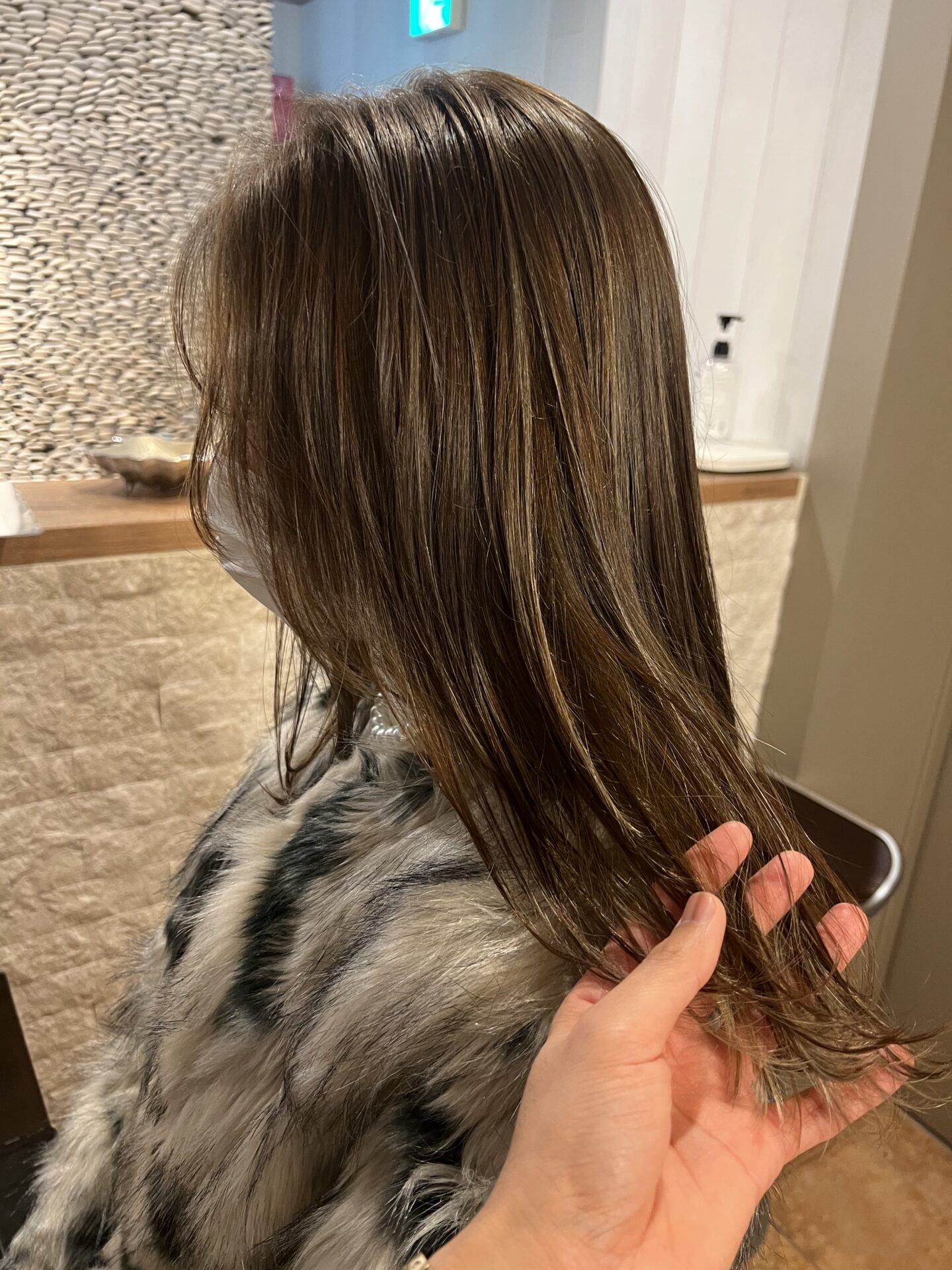 前回、別のお店でガッツリハイライトを入れて、最初は良かったけど、伸びてきたら巻かないと汚く見えてとお悩みのお客様。