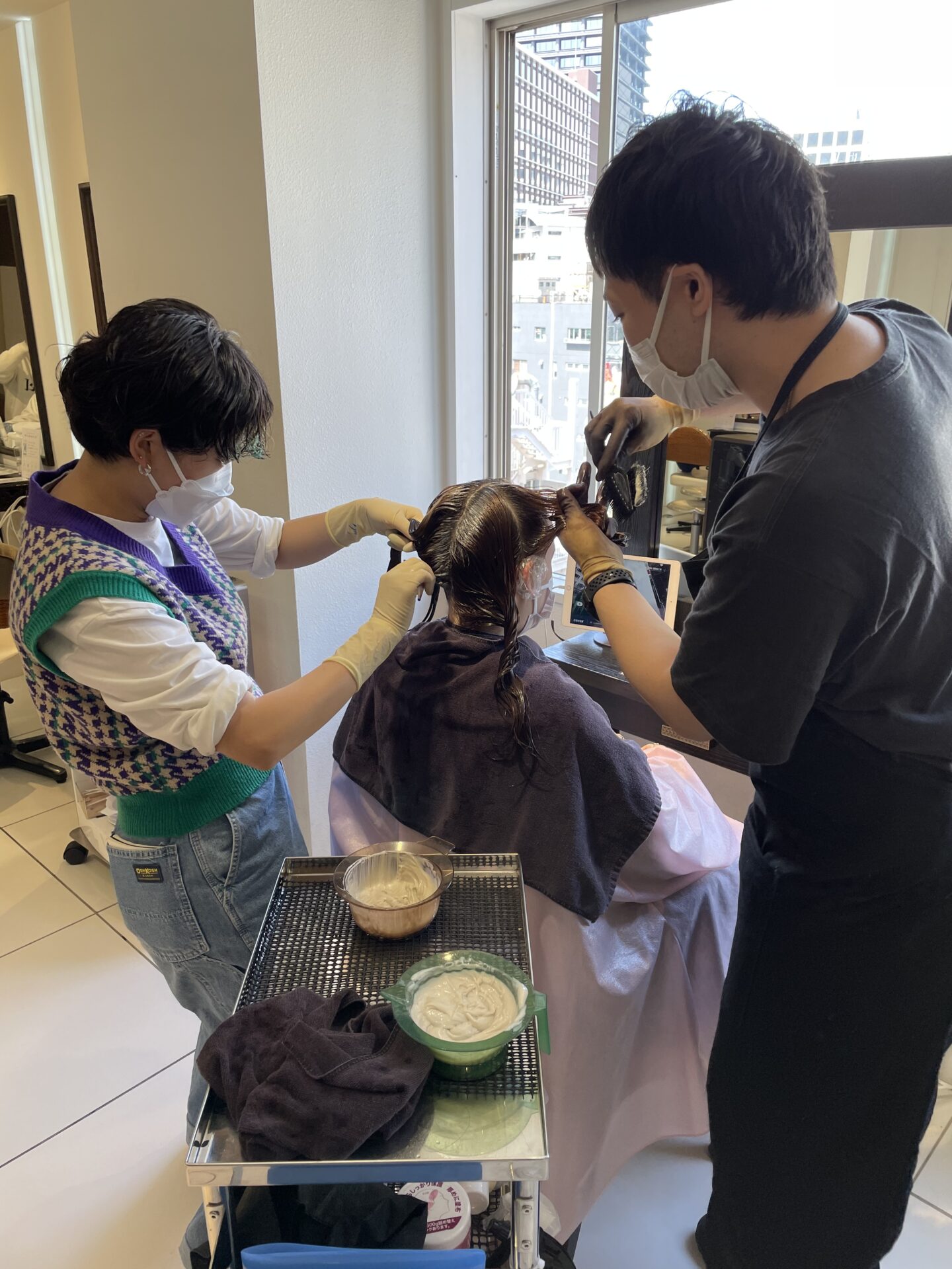 そんな中さっそく1年目の今園さんがカラーを先輩と一緒に塗りました!