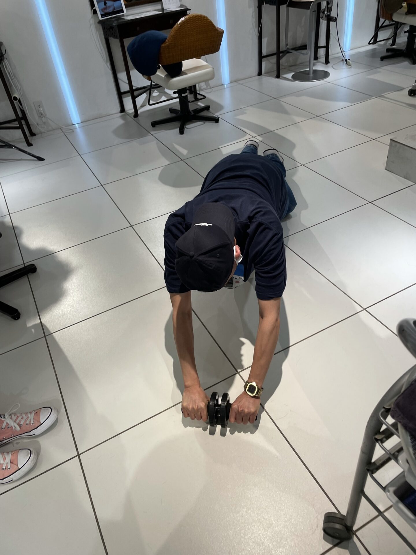 先輩が腹筋ローラーを買ってきてくれ、営業後みんなで筋トレをしてます笑