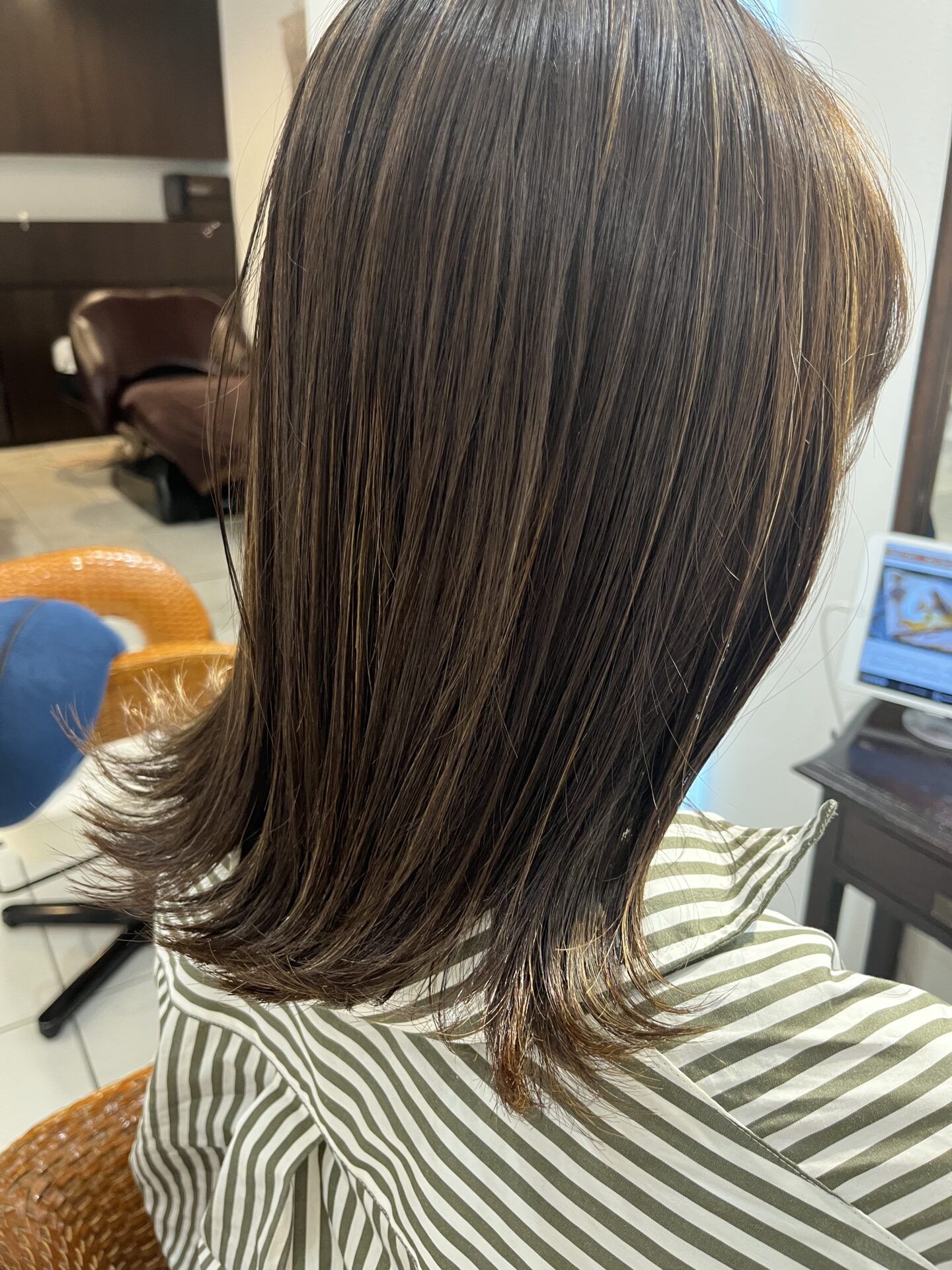 全体的にトーンダウンして、さりげないハイライトが入って、結んでも、少しアイロンを入れてオイルを付けても、可愛い仕上がりに!