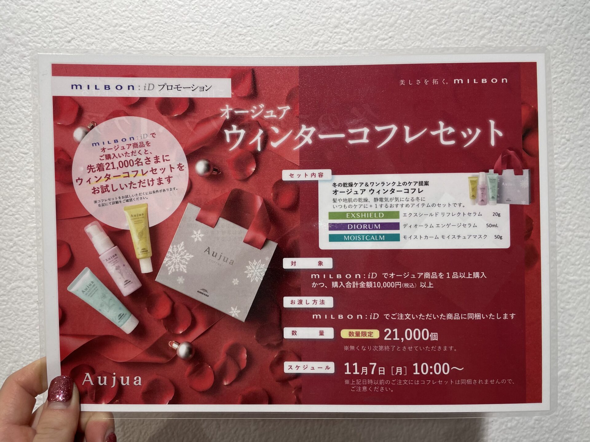 そして、milboniDからオージュア商品1品以上かつ、購入合計金額1万円以上お買い上げで、オージュアウィンターコフレが貰えます!こちらは21000個限定です!