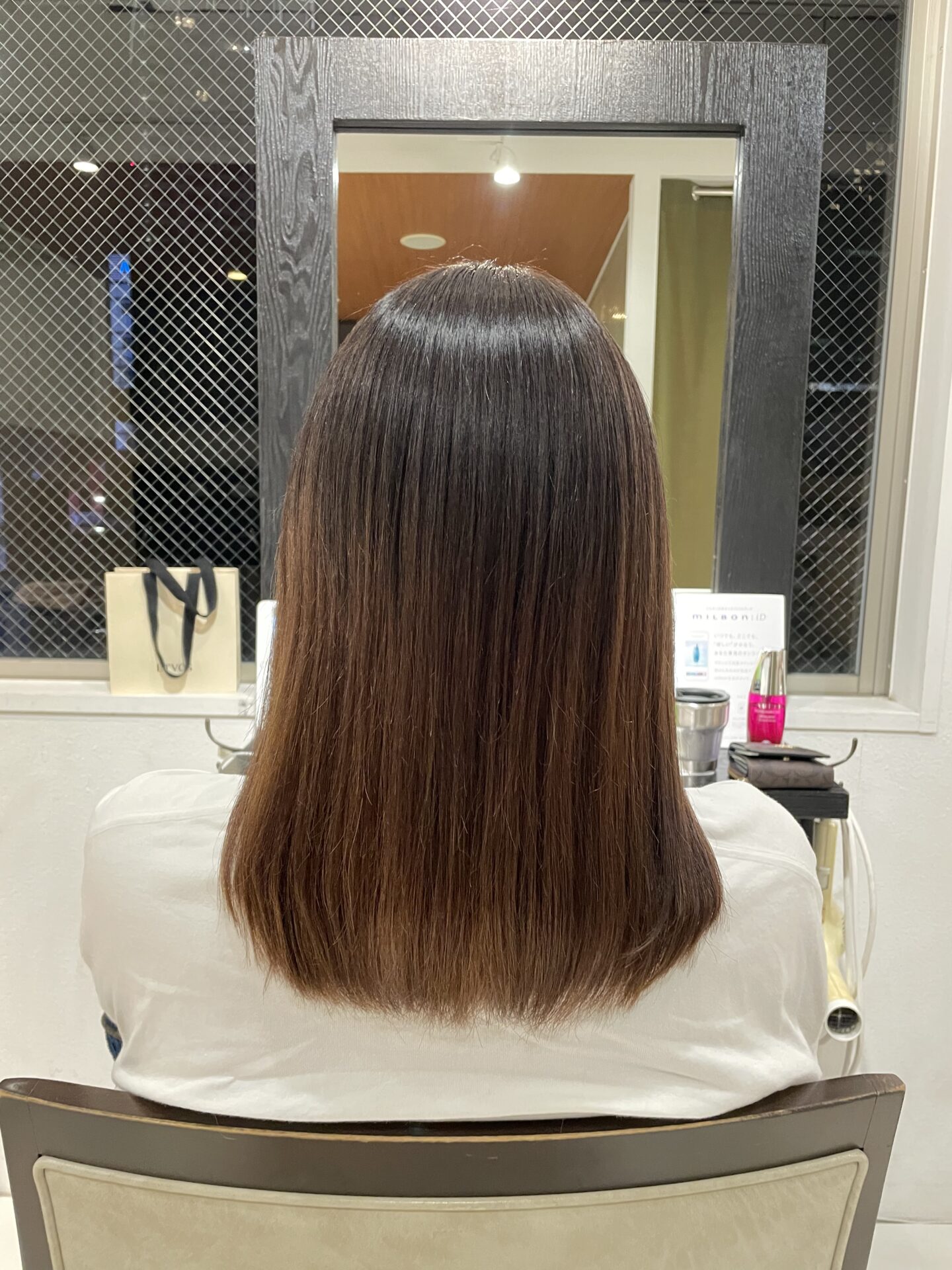 仕事であまり髪を明るく出来ないけど、表面の方にブリーチ毛が残っているので、そこと繋げる為に馴染ませメッシュをやりました!