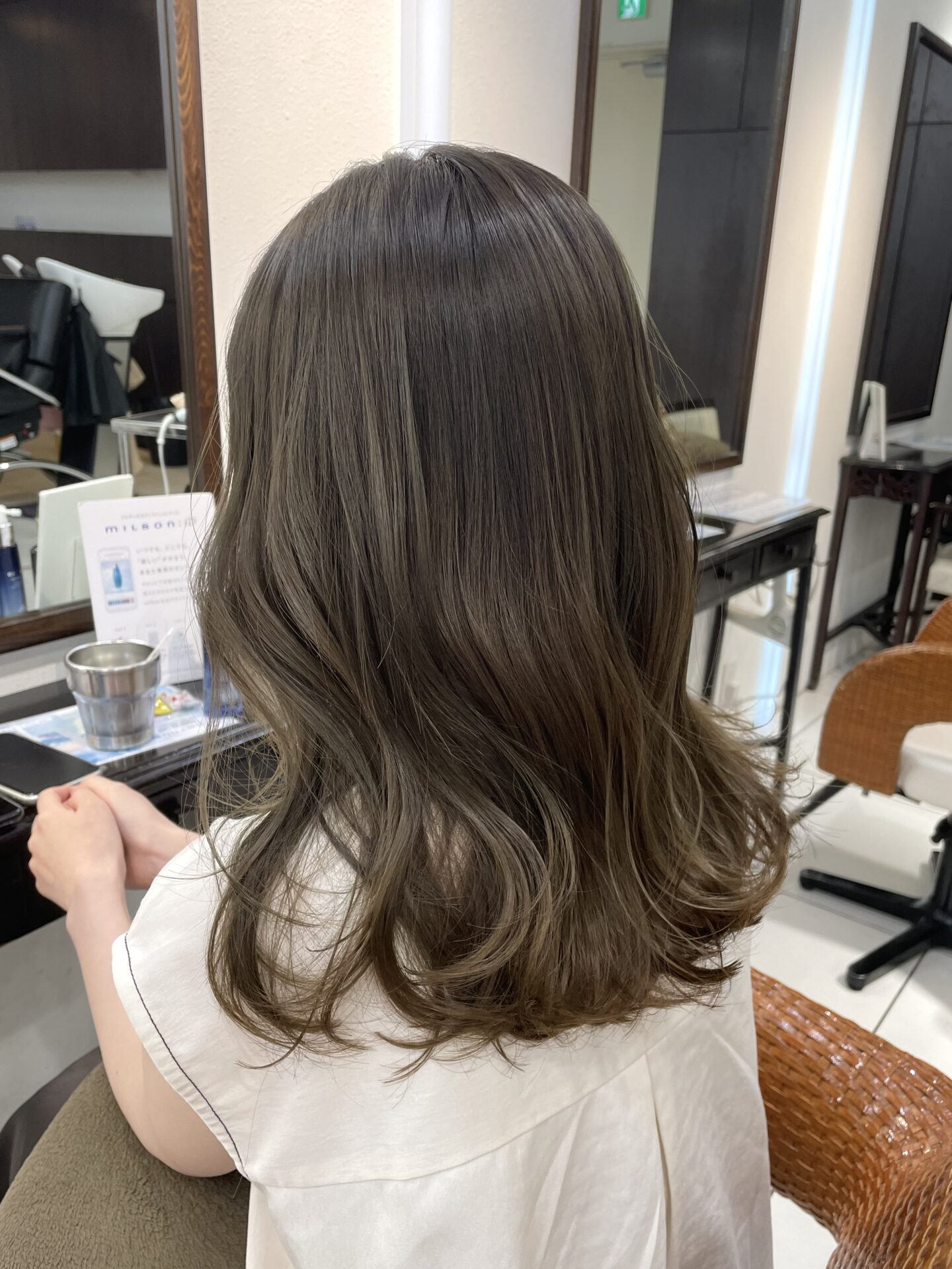 オリーブベージュはくすんだグリーンっぽいお色と透明感のあるベージュを混ぜたヘアカラーになります。