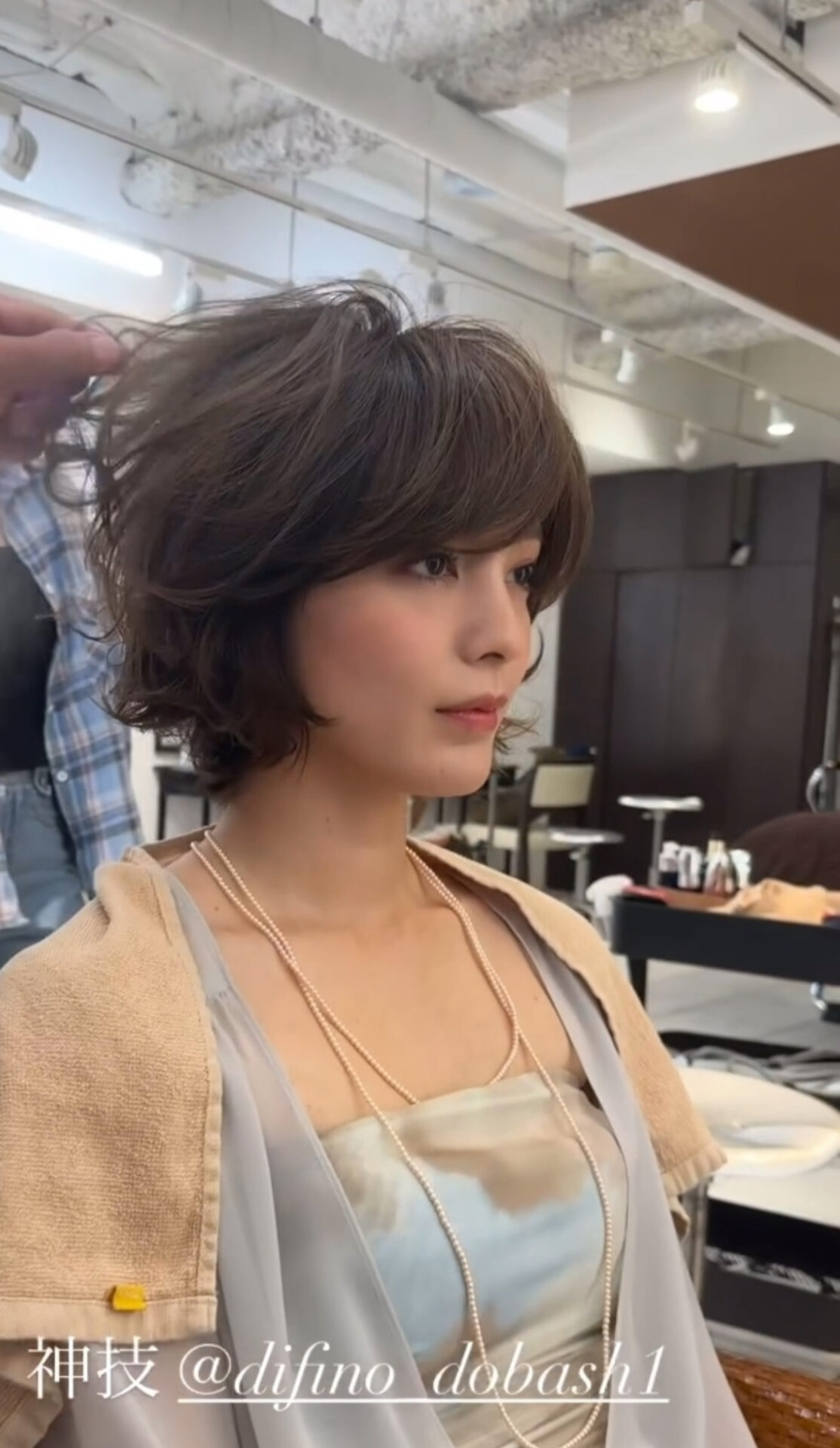 面長で寂しく見えがちなところを、トップはふんわりさせて、ひし形シルエットを作り、毛先を遊ばせれば、最も簡単に外国人カールウェーブの出来上がり〜