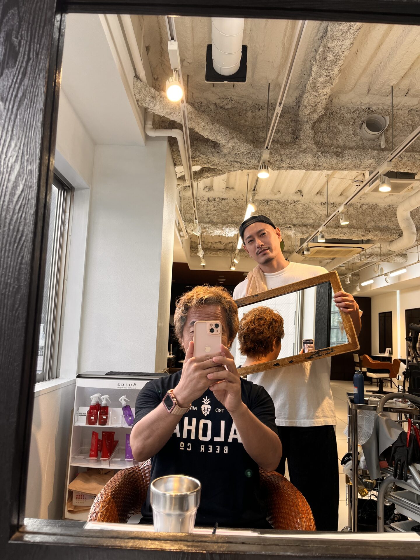 今回もデジタルパーマをくりくりにかけてもらうんですが、短くしてもらったので、みんな巻きづらくて、笑いが出てます〜