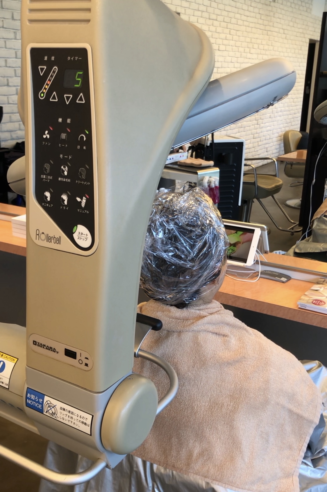 ②髪の内部のカルシウムイオンをトリートメントをつけ熱をあてて除去していきます。(約5分)
