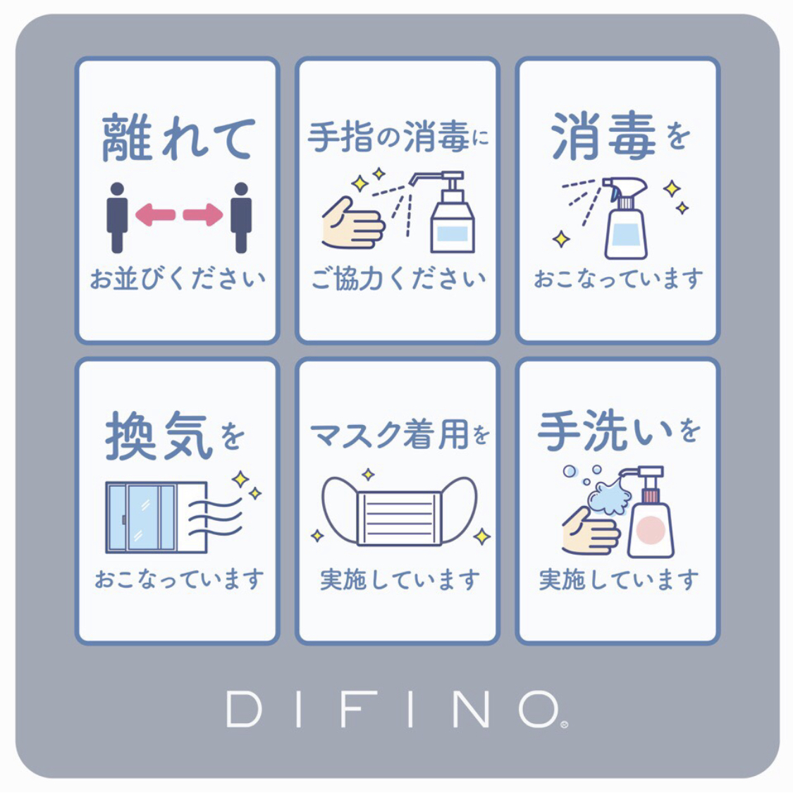 DIFINOでは、お客様とスタッフの安全、安心を守るため、今まで以上に適切な感染防止策を施した上で営業致します。