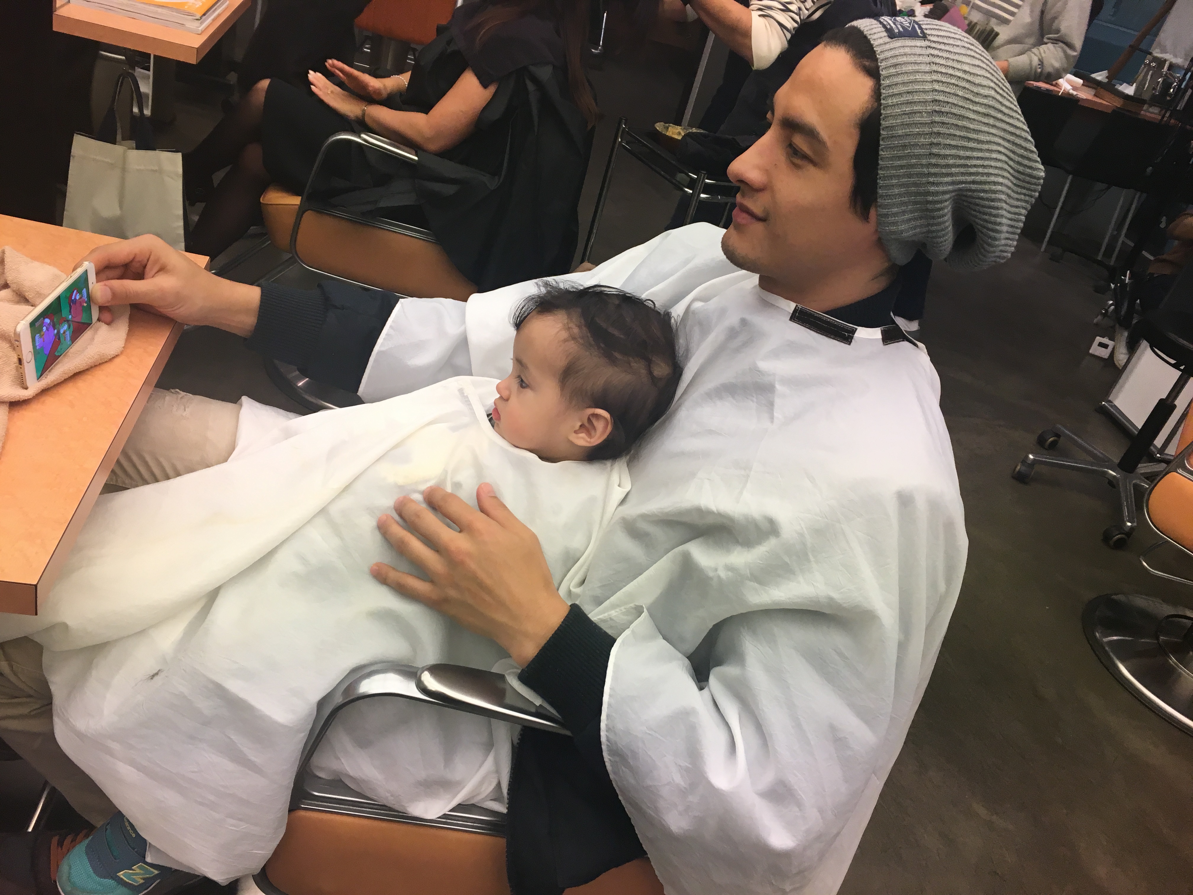 一人で椅子に座ってカットできないお子さんはこうやってパパやママのお膝の上でカットできます♪