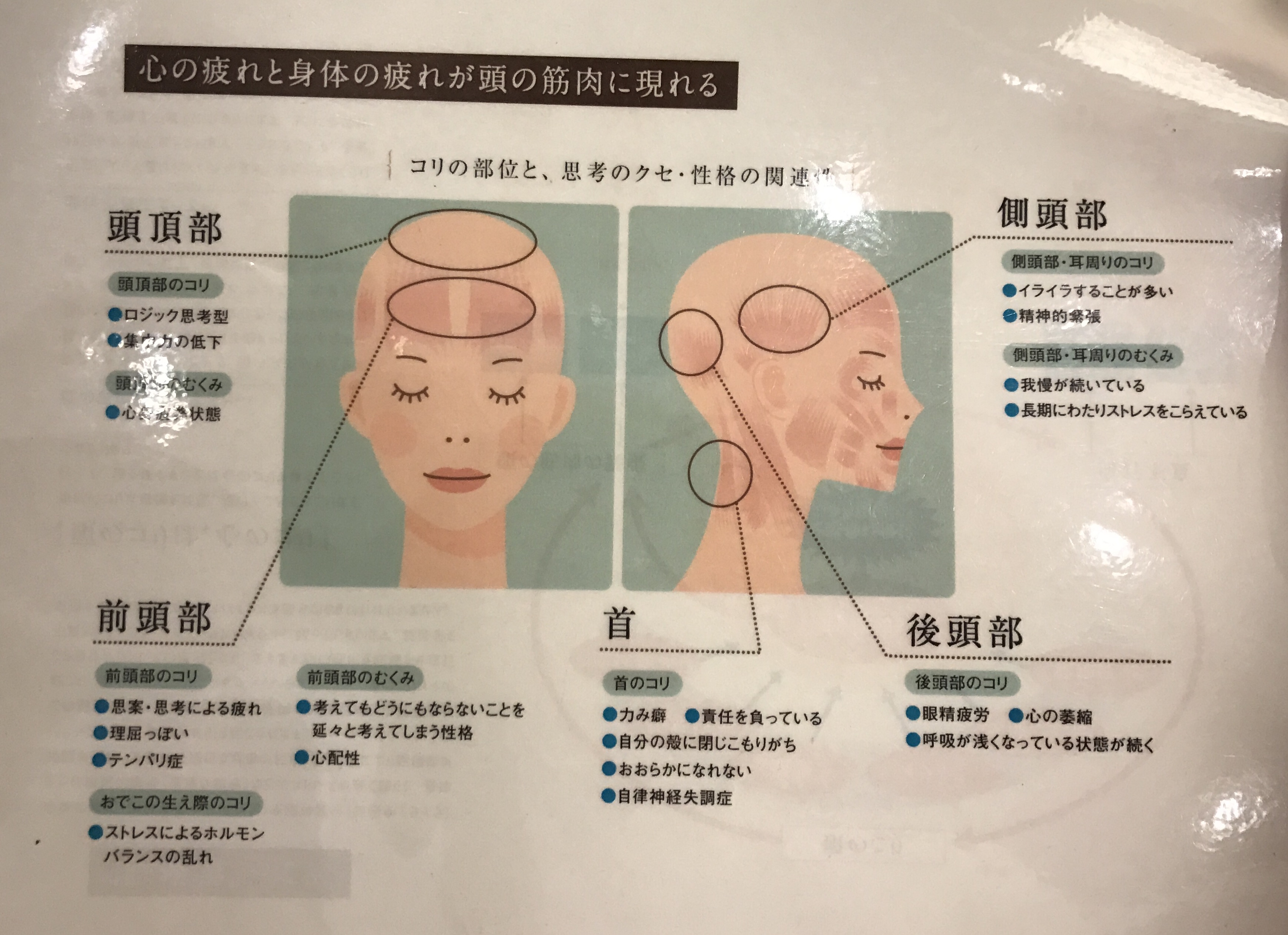 頭の筋肉の緊張で顔のたるみ、ほうれい線、おでこのシワ、思考力の低下、免疫力の低下不眠の原因になります。