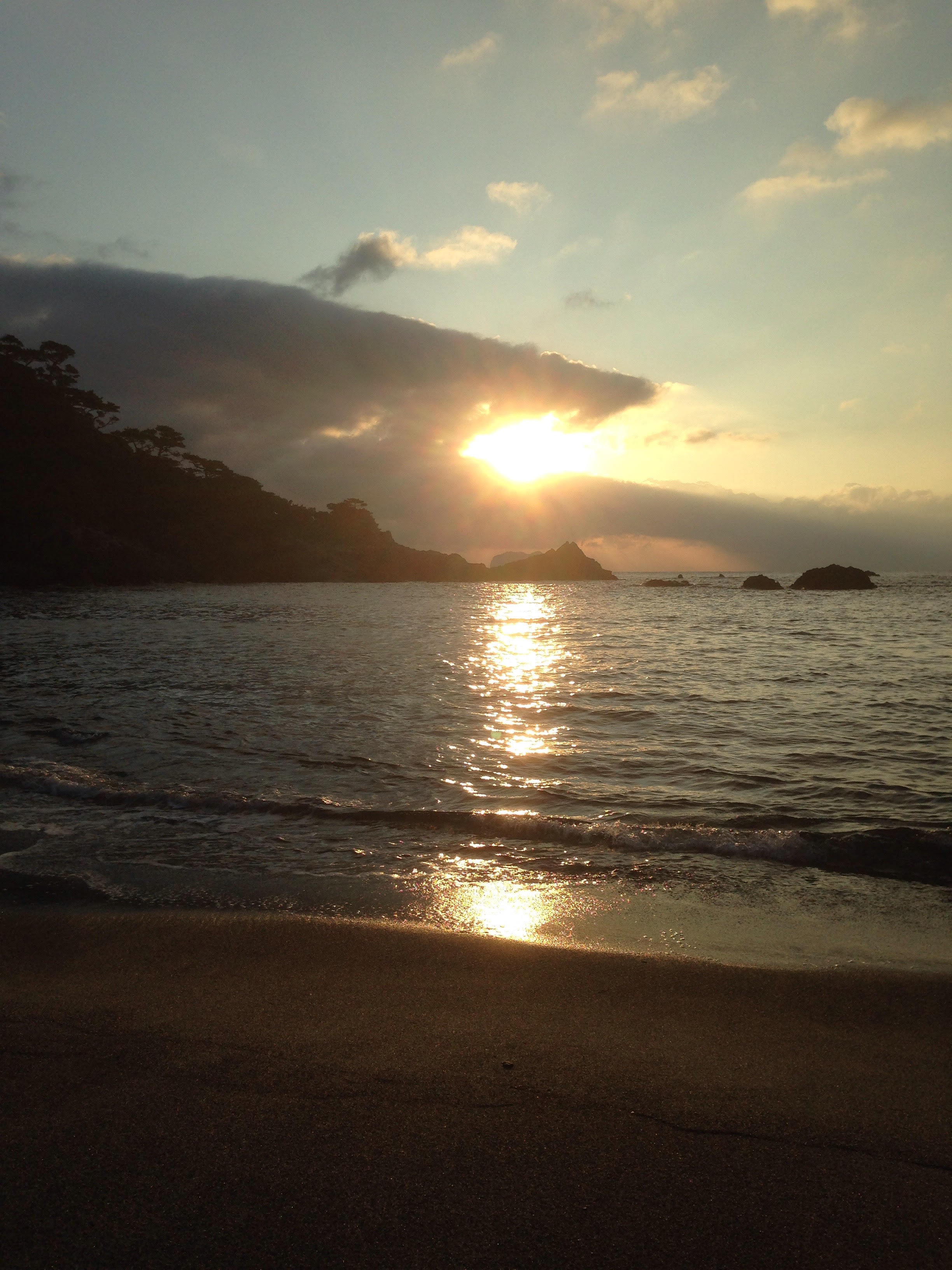 前浜海水浴場。白い砂浜がずっと続いてます。ここで静かに昼寝。気付いたら夕方でした。