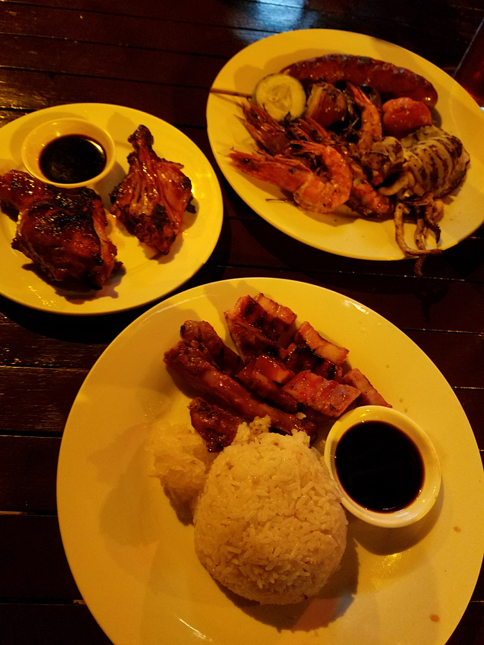 心地いい音楽と波の音を聞きながら食べます。シーフードのBBQとガーリックライスにビール・・・すごく美味しかったです。