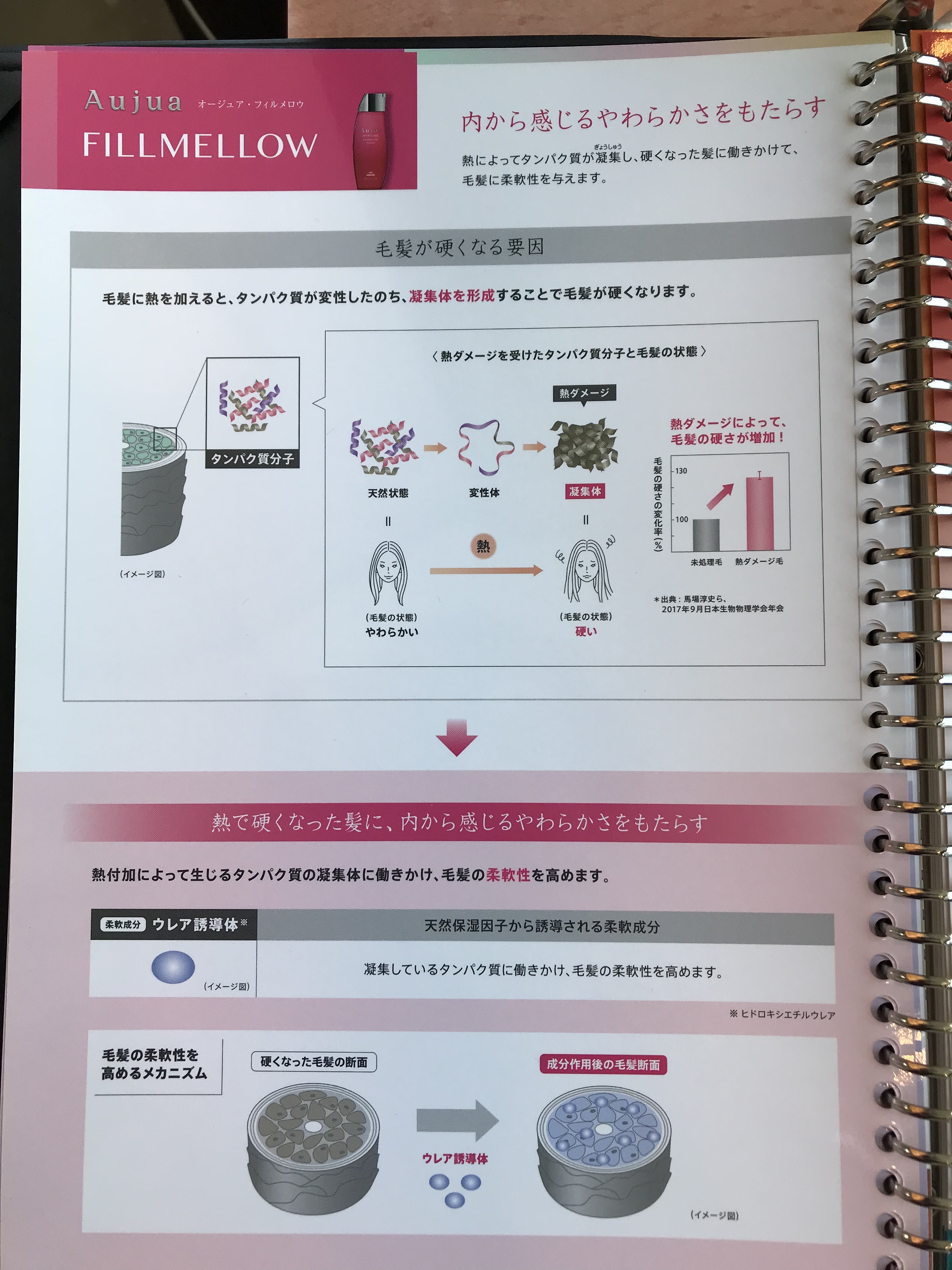 このFILLMELLOの中にはウレア誘導体という成分が含まれていて、このウレア誘導体はアイロンやドライヤーなどの熱で硬くなったタンパク質(髪の毛はタンパク質でできています!)を柔軟にしてくれる効果があるので、仕上がりの髪の毛がとても柔らかく指通りの良い仕上がりとなります!😆