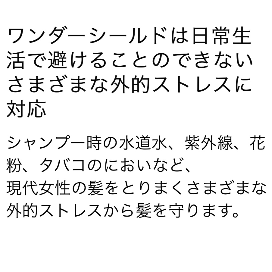 【効果】●日常生活、7つの外的ストレスから髪を守ります
