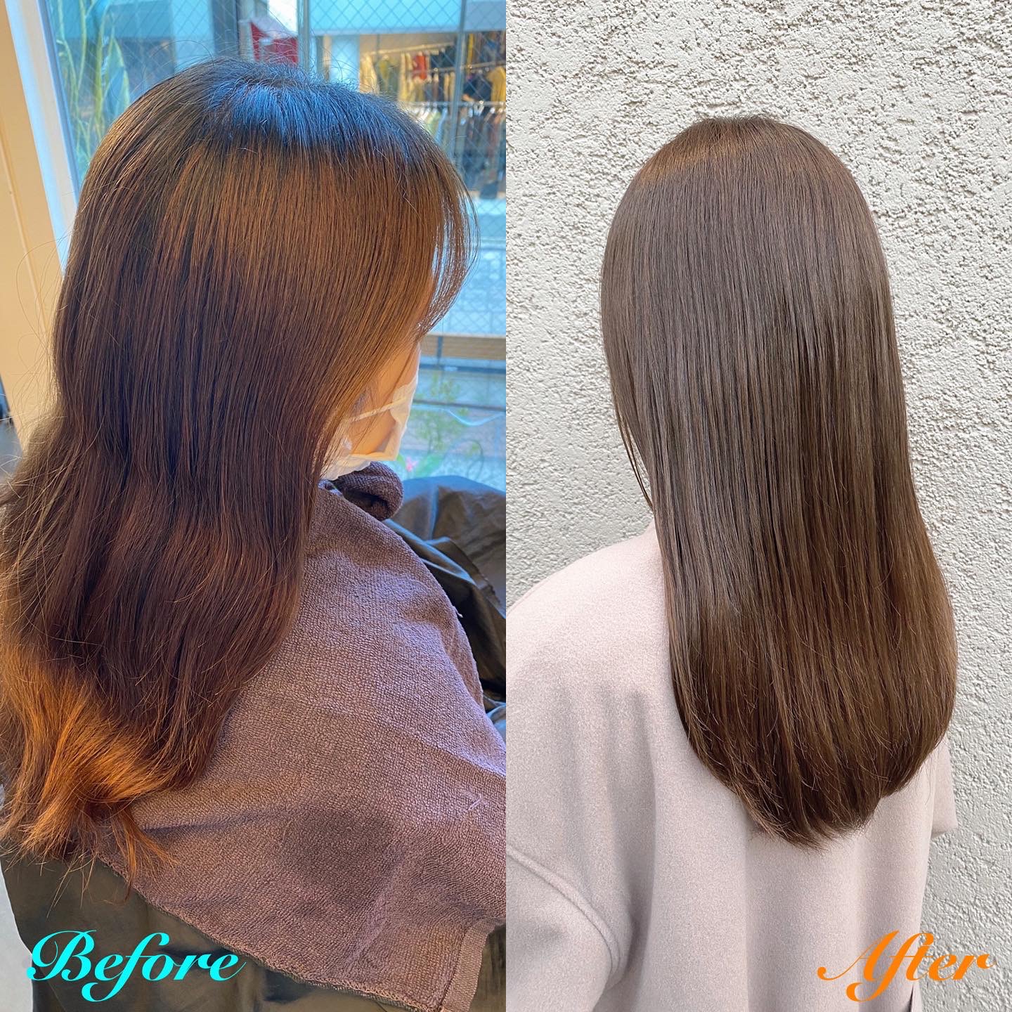 久しぶりのカラーで退色が赤っぽく色落ちしていたため、今回はグリーン系のカラー剤を使って赤みを消したカラーをさせていただきました!