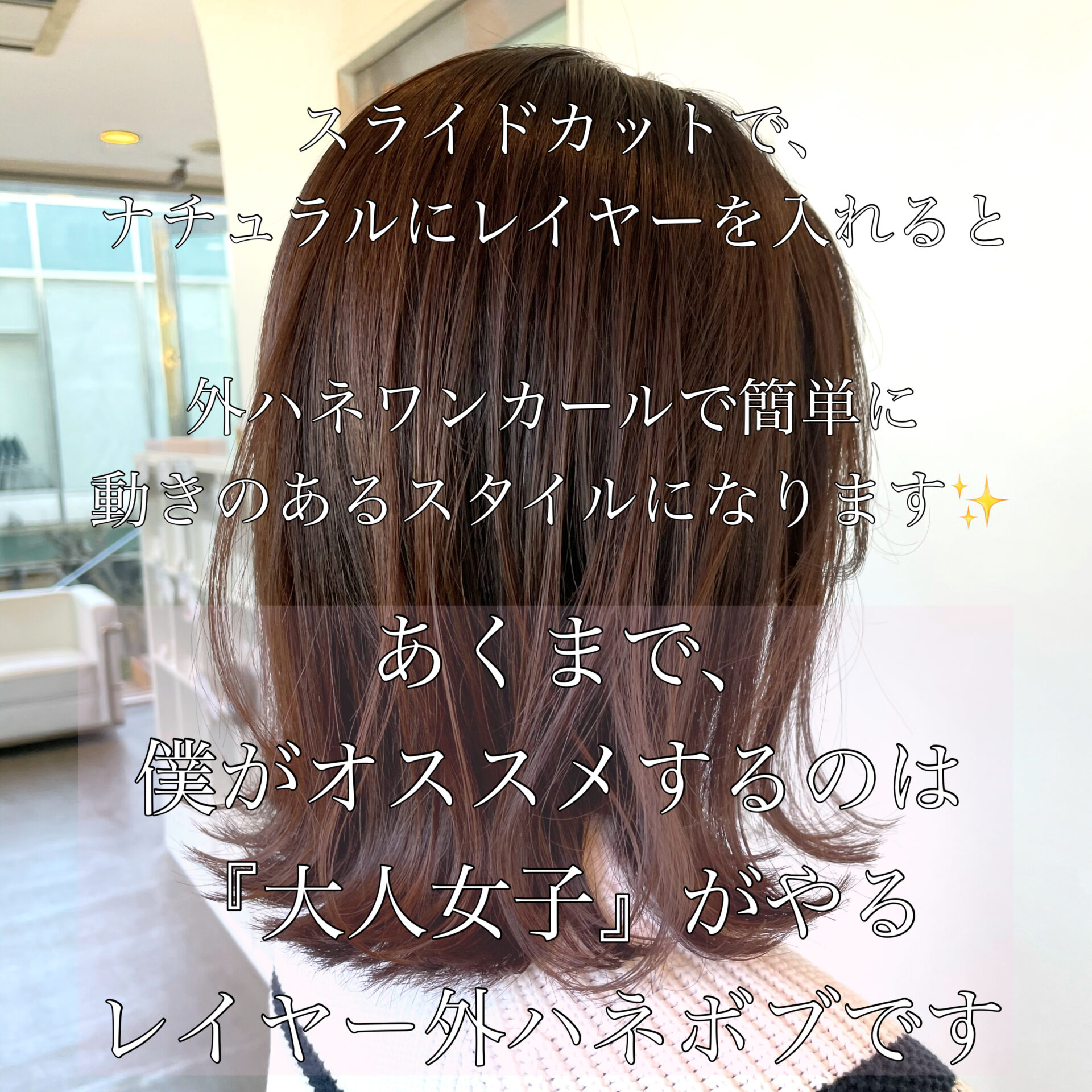 スライドカットをする事で、風を含んだような、思わず触りたくなるヘアスタイルを作るのが得意です♪