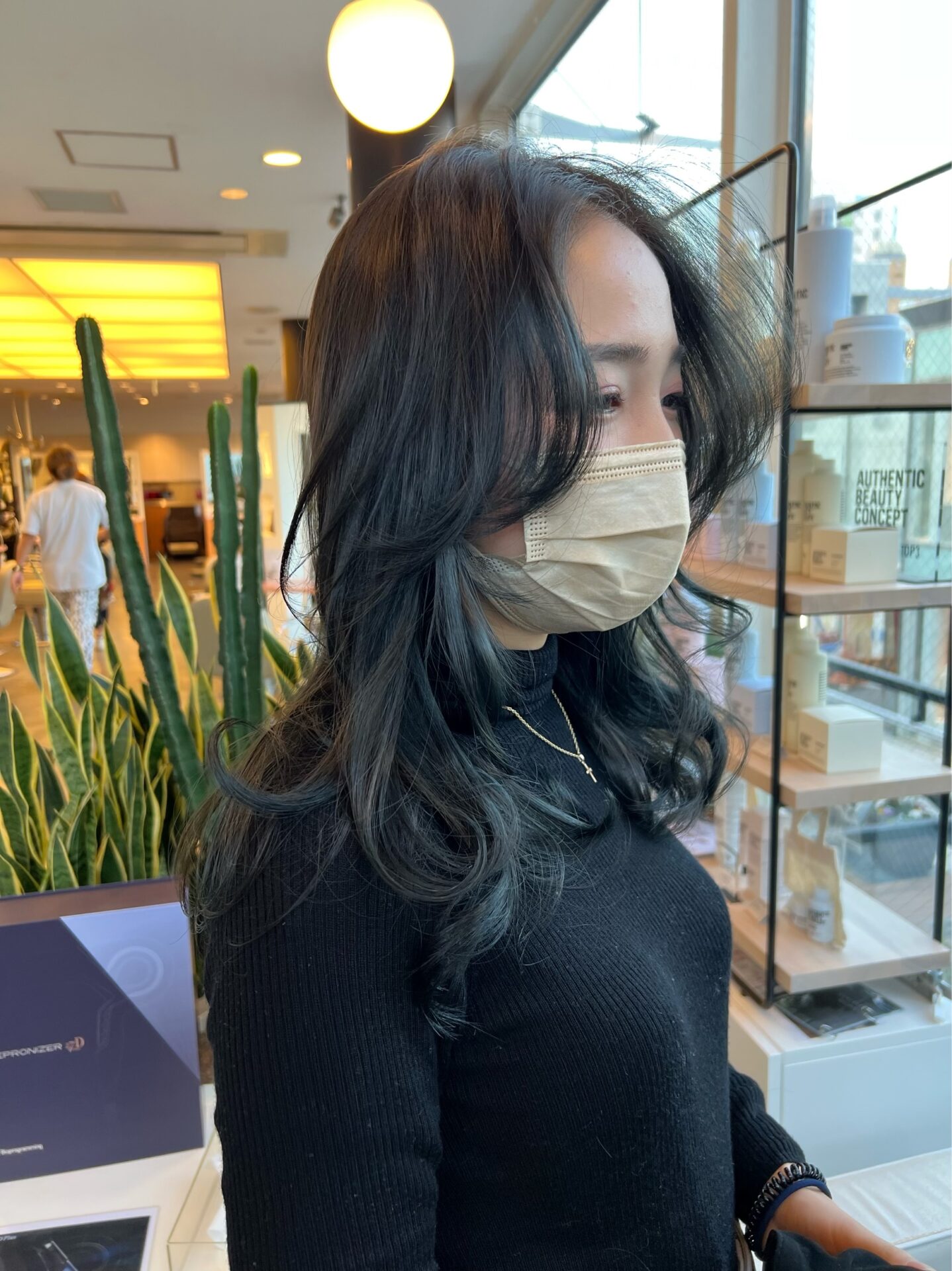 大人気の顔周りカットと全体にレイヤーをたっぷりいれて透明感のあるブルーブラックカラー!