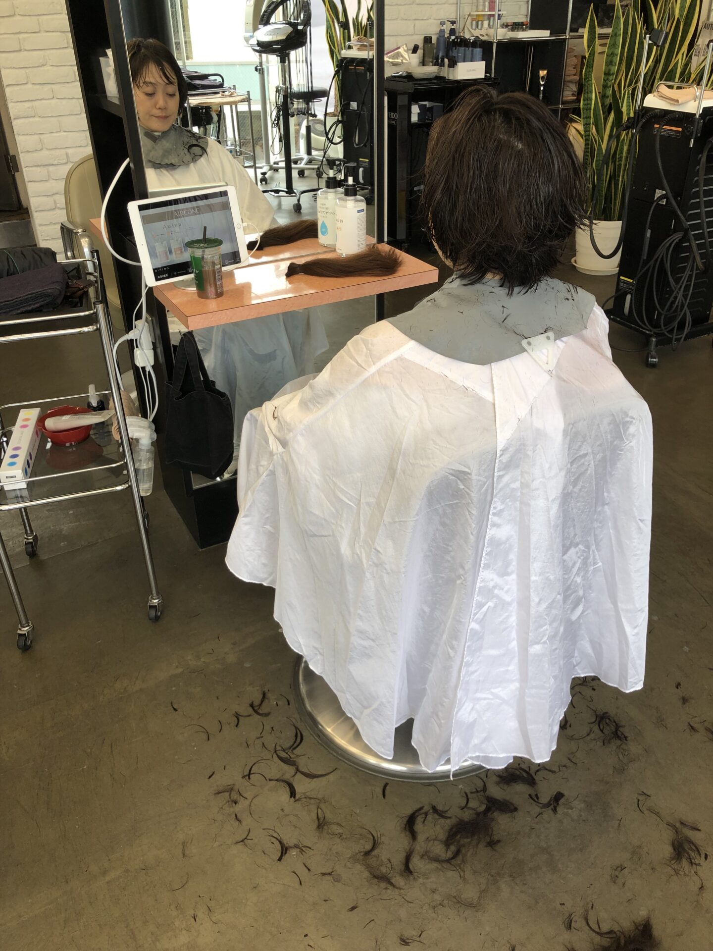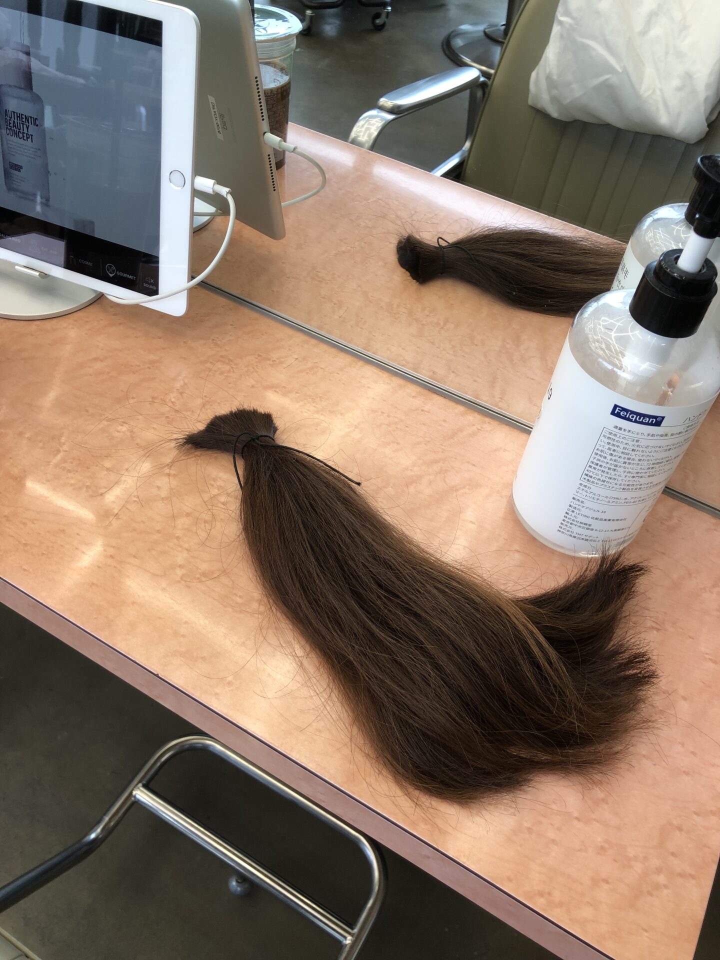 まずは長さを切っちゃう10年ぐらいかけて一生懸命伸ばして来た毛はチョキチョキとあっという間にカットっする