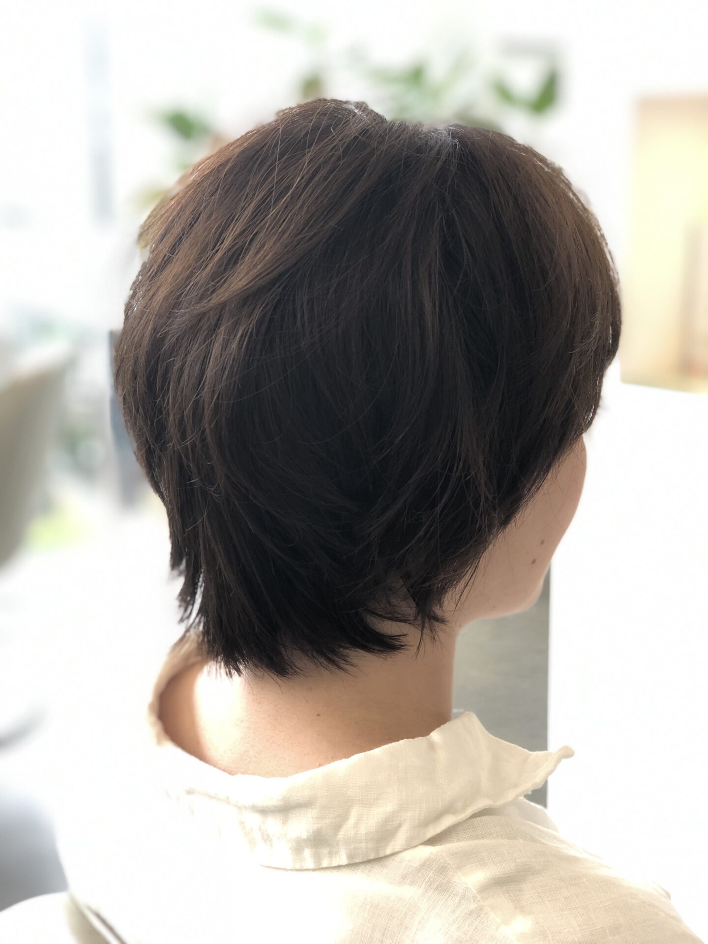 襟足少し残しめのショートウルフにカットしてみました短くしたいと言うけど襟足も空いている方でして、クセがあるから切りすぎ高さも出ちゃうので短く癖が出ないように長く残すところも作るそれが大人ショートの鉄則ではないでしょうが?