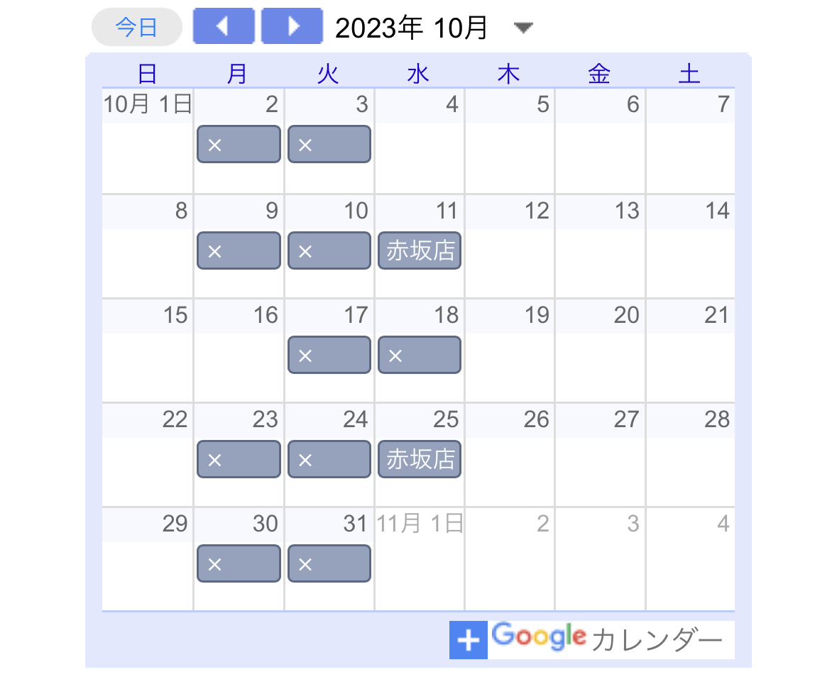 第2、第4水曜日の2日は赤坂出勤になりますのでよろしくお願いします。