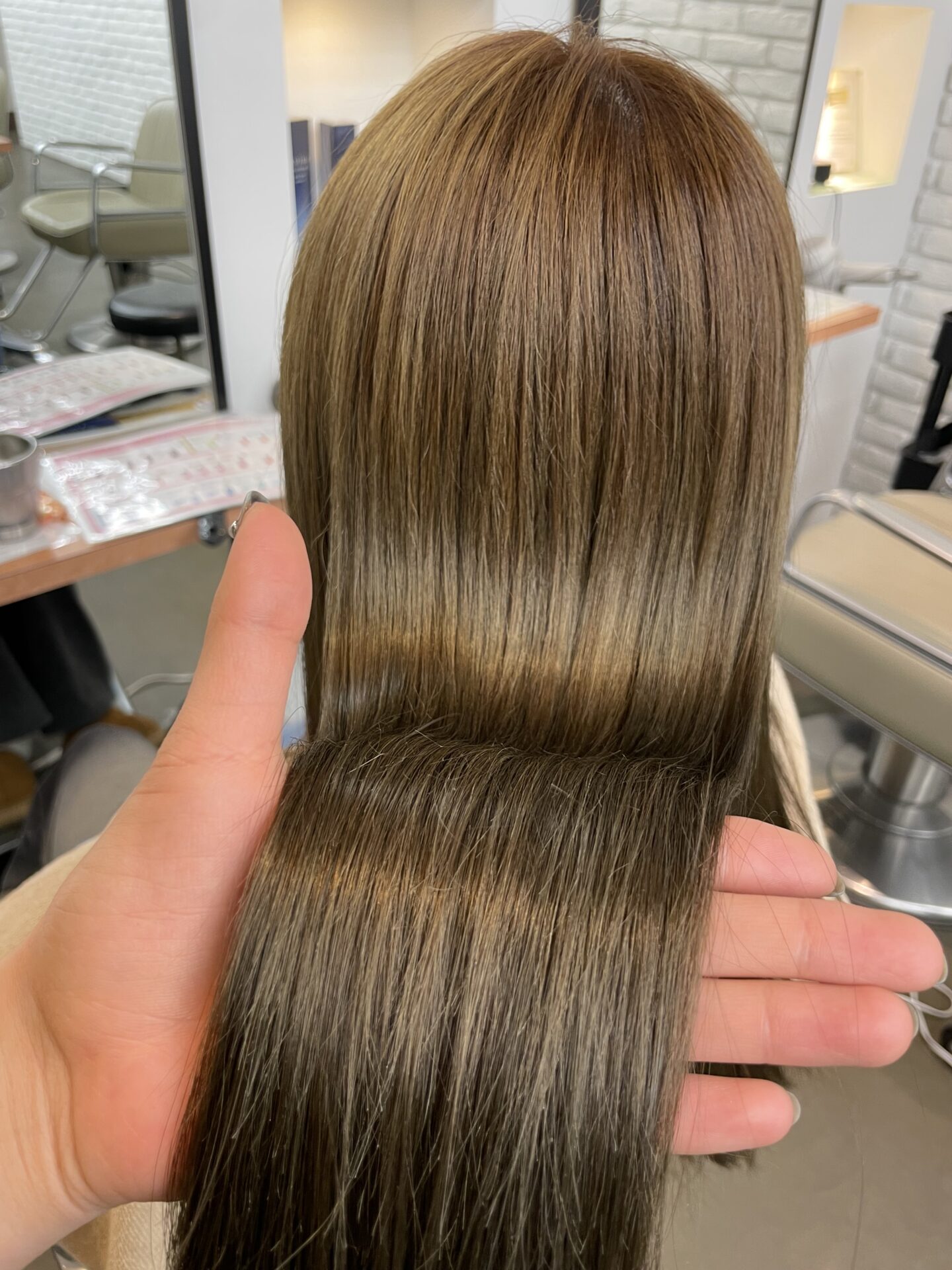 このモデルさんはオレンジに色落ちしやすいので寒色のグリーンを混ぜて透明感を出しました!ダブルカラーをしたことがある方で繋がりを作りつつ綺麗なカラーに仕上がりました!