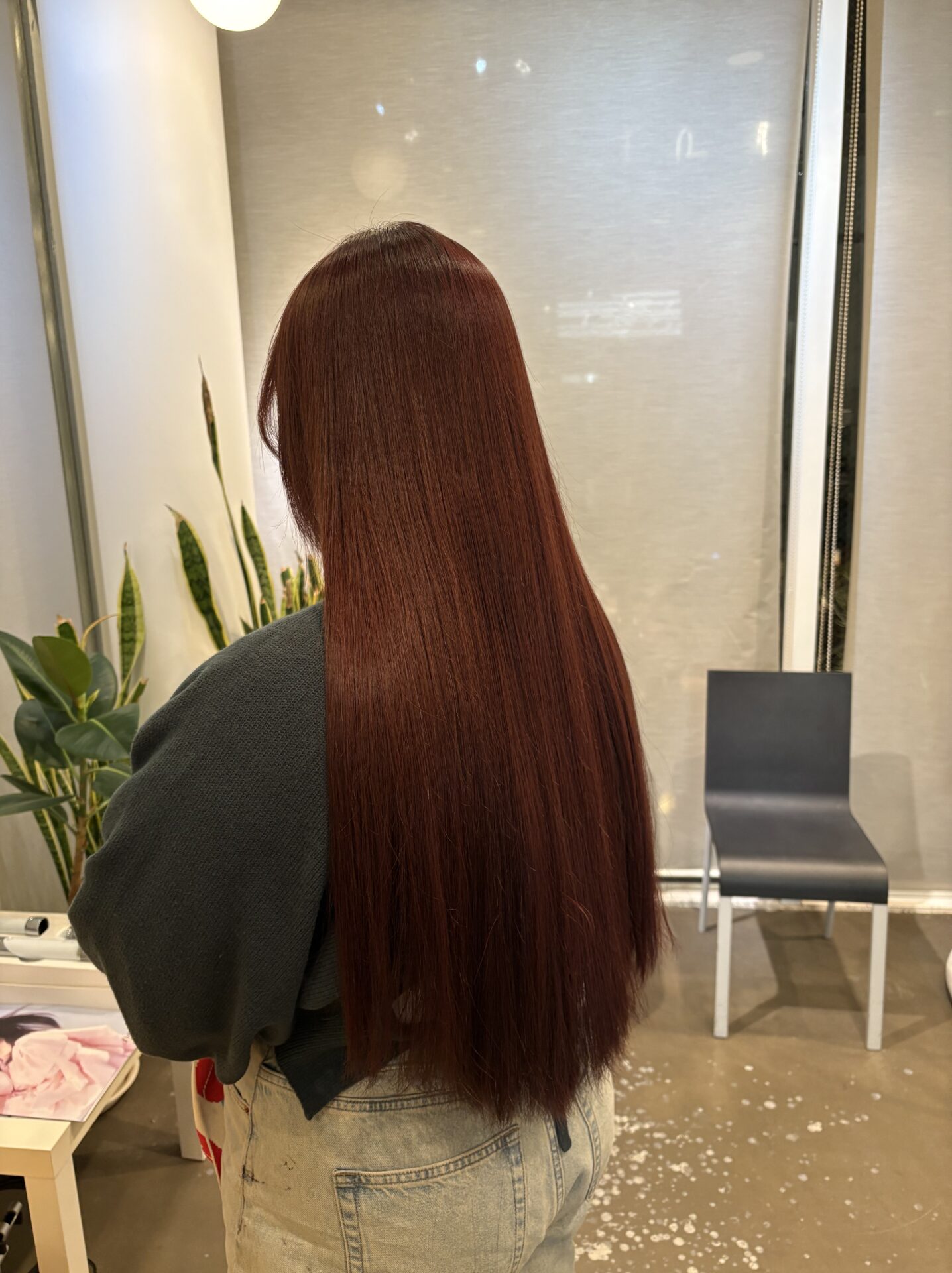 希望がレッドとオレンジの間くらい、レッド寄りだったので赤み強めのほんのりオレンジ🍊のカラー剤でやらせていただきました!