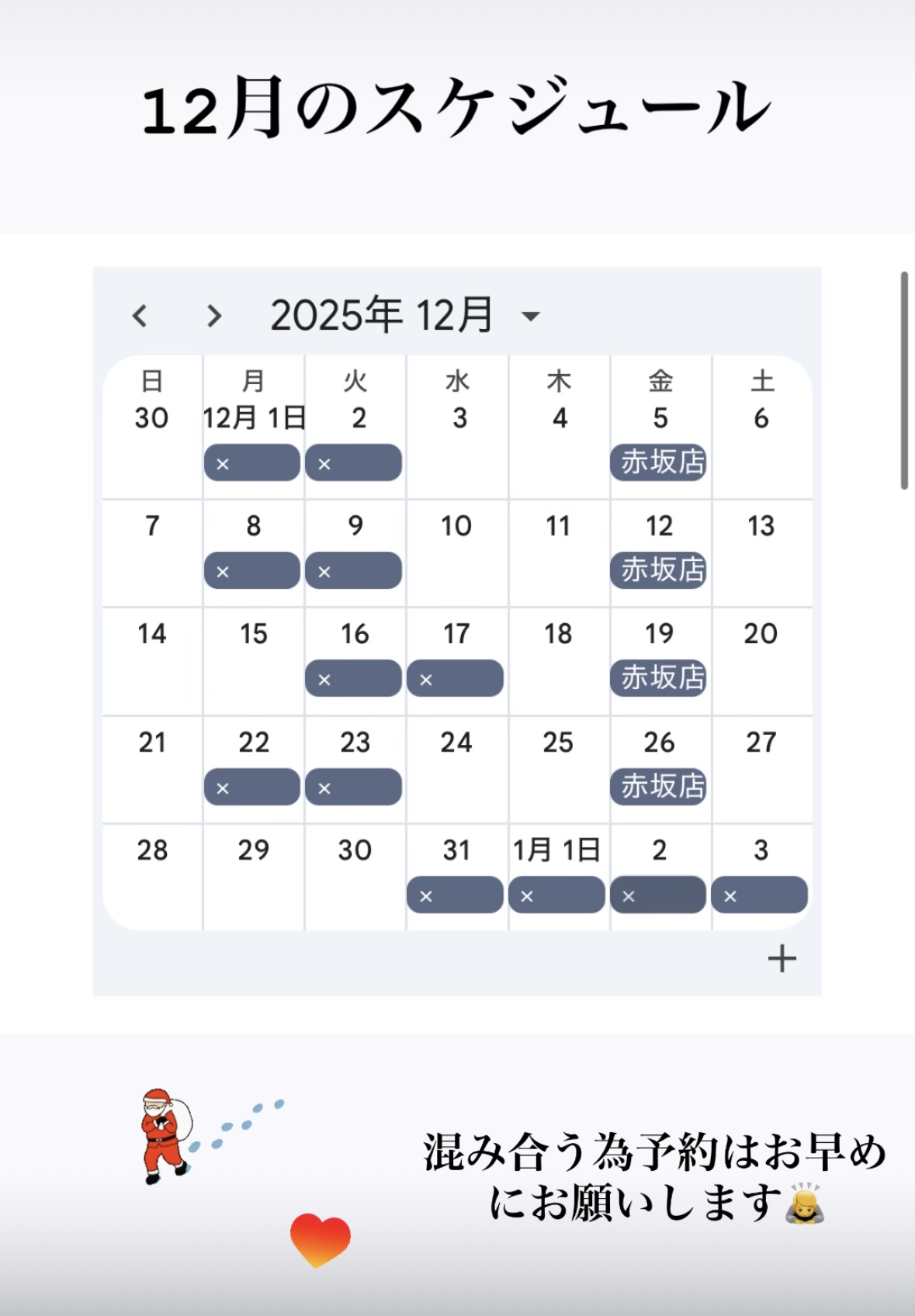 12月のスケジュールはこちらもう土日は予約がかなり入って来ているので早めのご予約お待ちしてます。