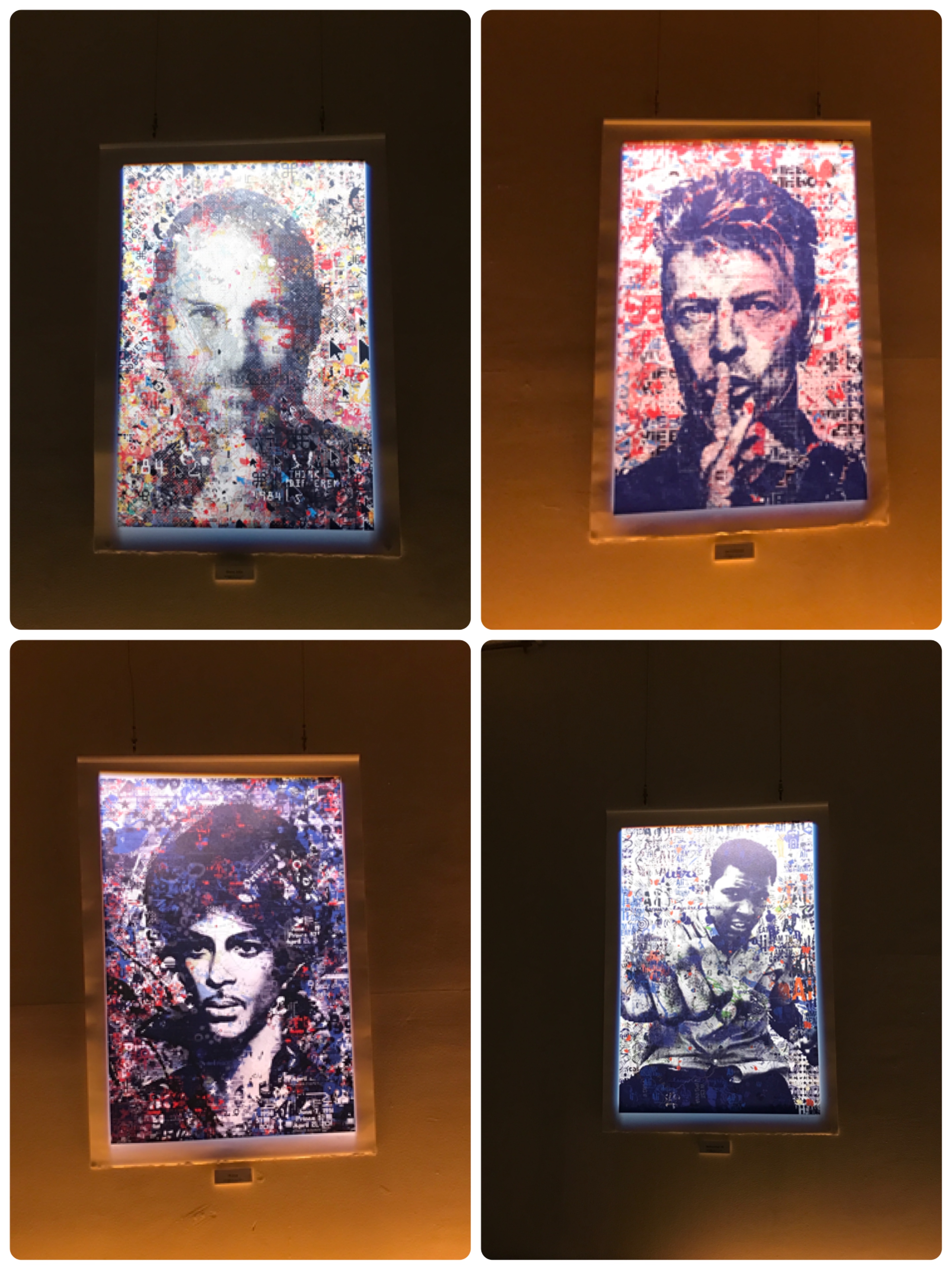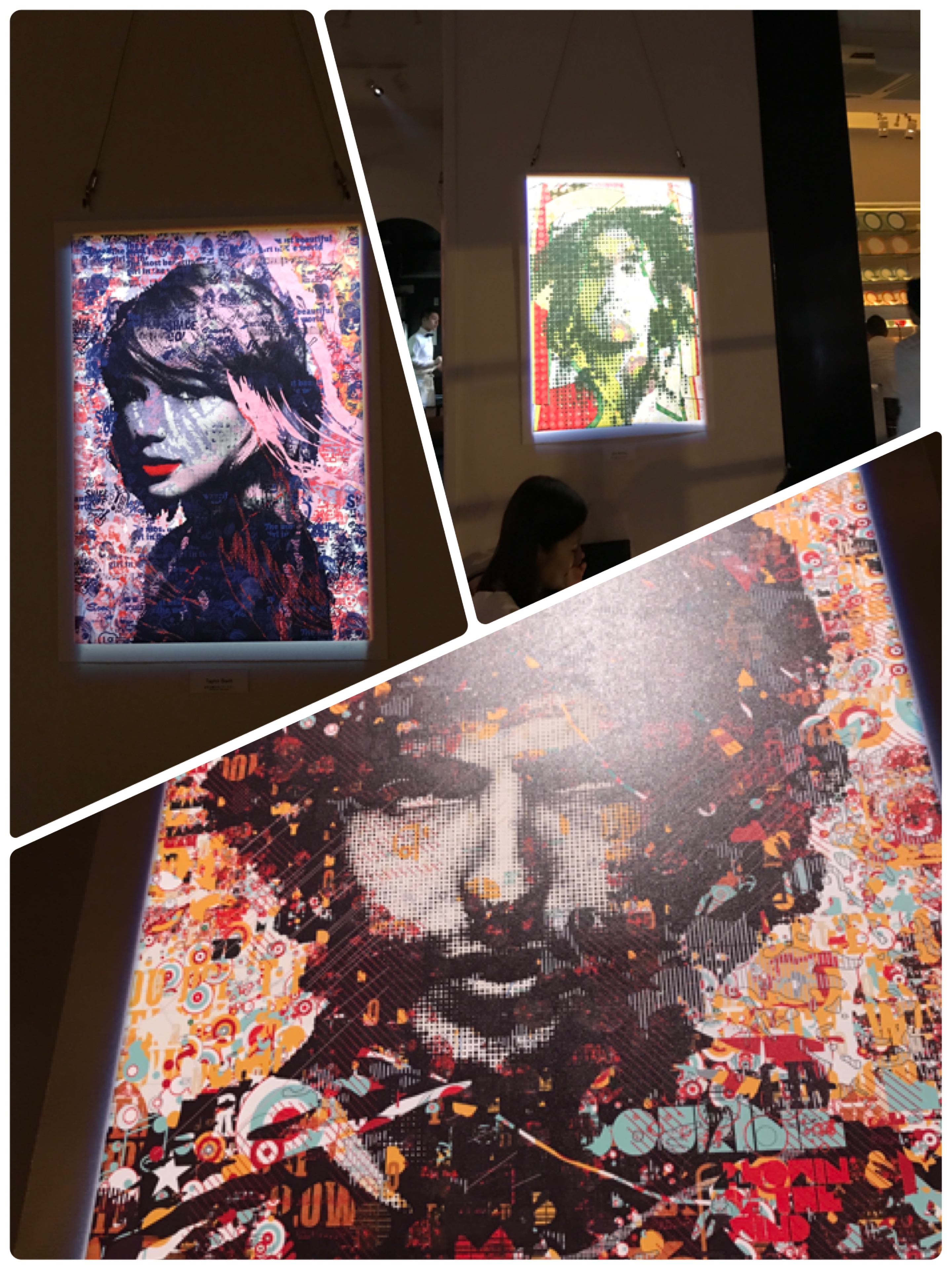 シルクスクリーンに描かれた作品が壁に浮かび上がるようにライティングされて、不思議な感じ。